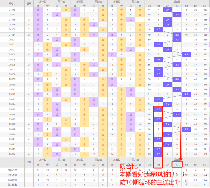 上期质合比:1:5,近10期质合比出现情况:1:5、3:3、1:5、2:4、4:2、2:4、1:5、2:4、1:5、1:5,最近10期出1期3:3,出现1期4:2,出现3期2:4,出现0期5:1,出现5期1:5,出现0期6:0,出现0期0:6,根据近10期规律本期看好遗漏8期的3:3,防10期循环的三连出1:5,综上所述推荐质合比推荐:1:5,重点关注:3:3。