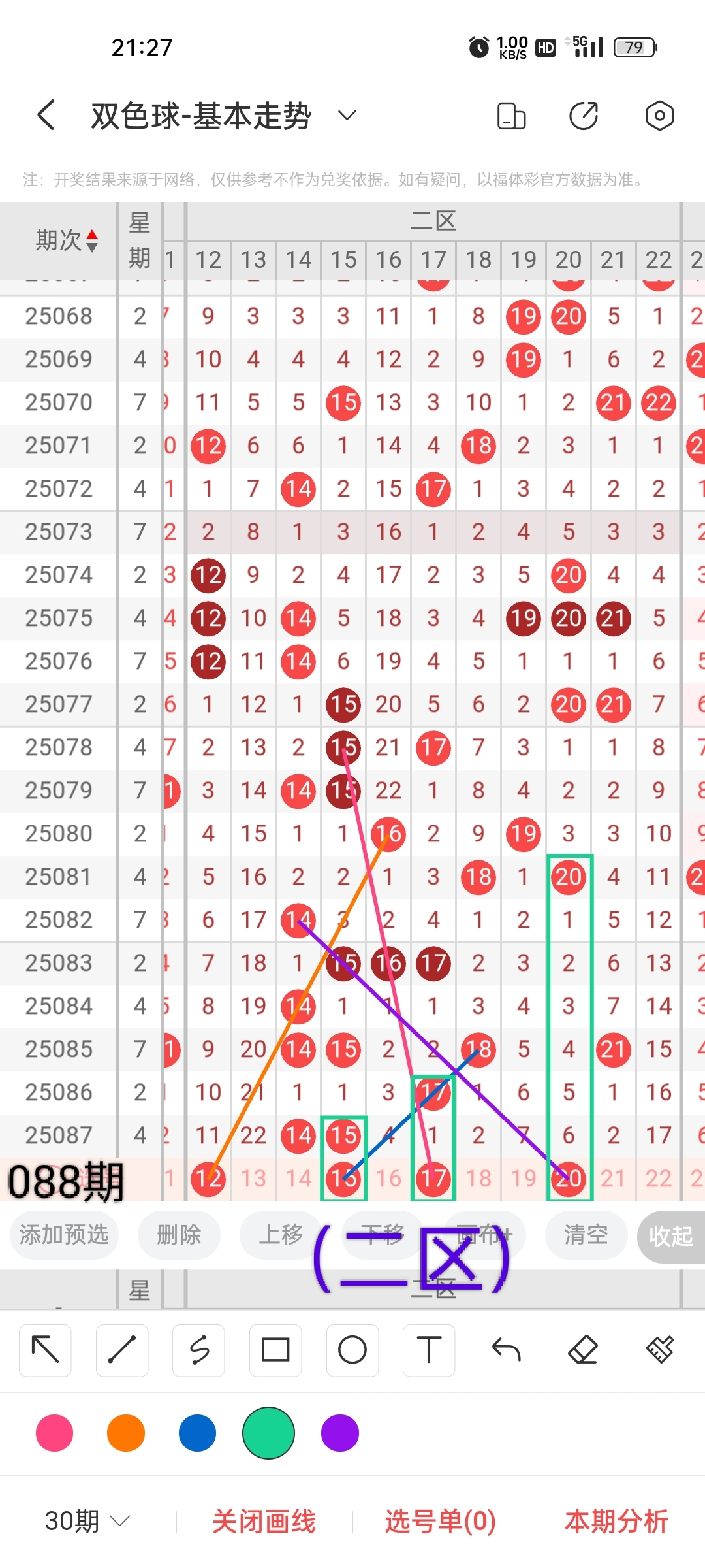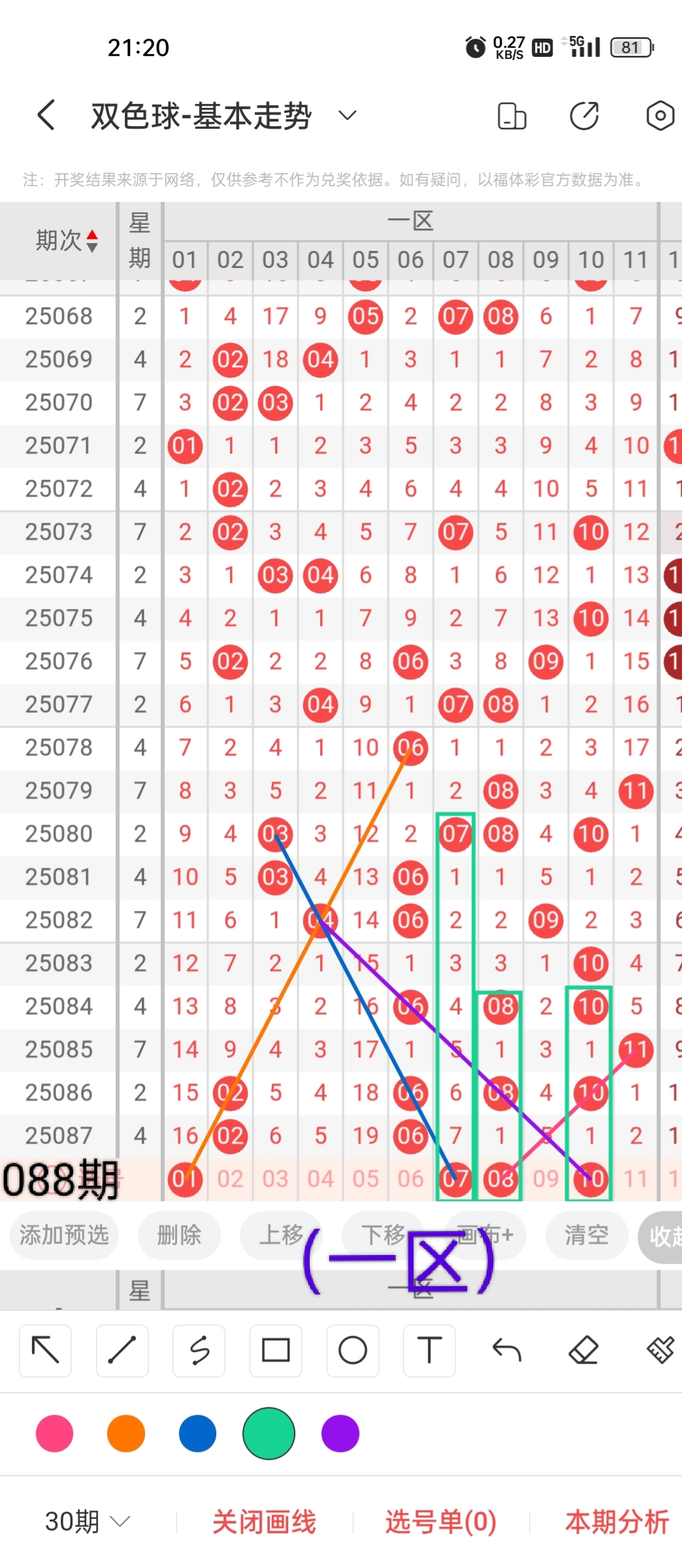 小梁根据图中画线思路,最后给大家汇总提供一下本期红球、蓝球数据,供大家参考: