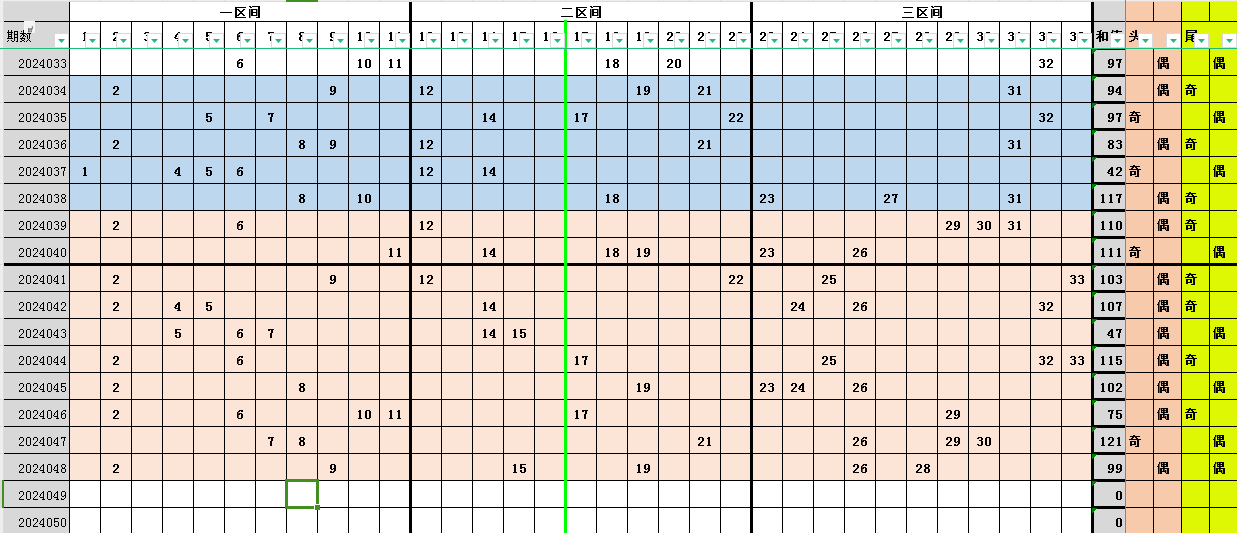 39期至48期一区总计开出23个红球,奇偶比7:16  40期一区开出1个红球,39期41期44期45期47期48期一区开出红球2 42期43期一区间开出3个,46期一区开出4个红球。