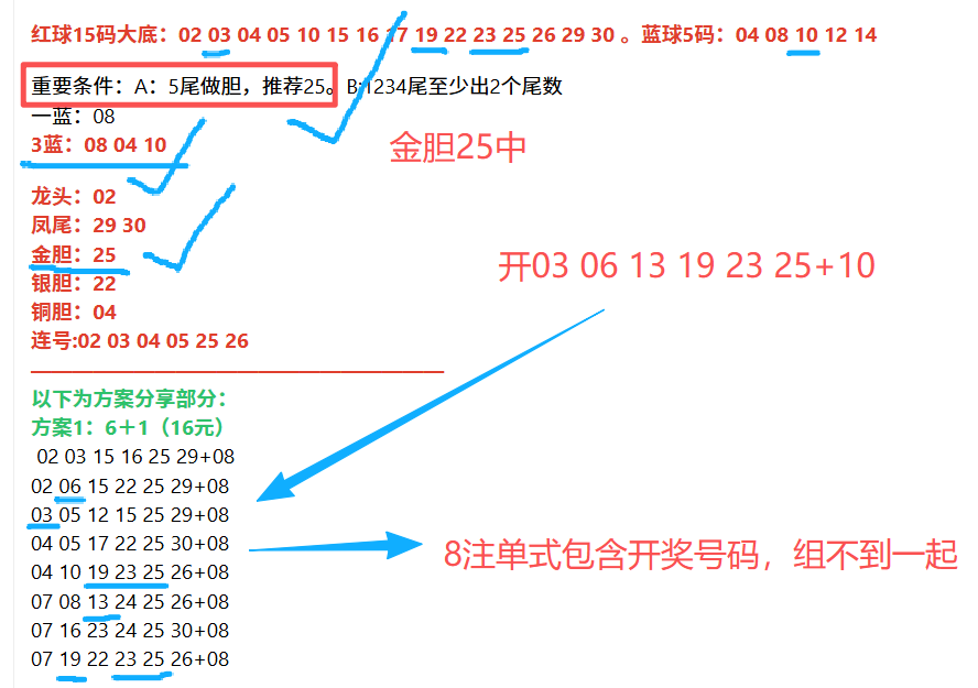 先回顾上期开奖号码:03 06 13 19 23 25+10.上期金胆25对,金胆连对两期,8注单式包含全部开奖号码,可惜组不到一组,蓝球继续命中10等