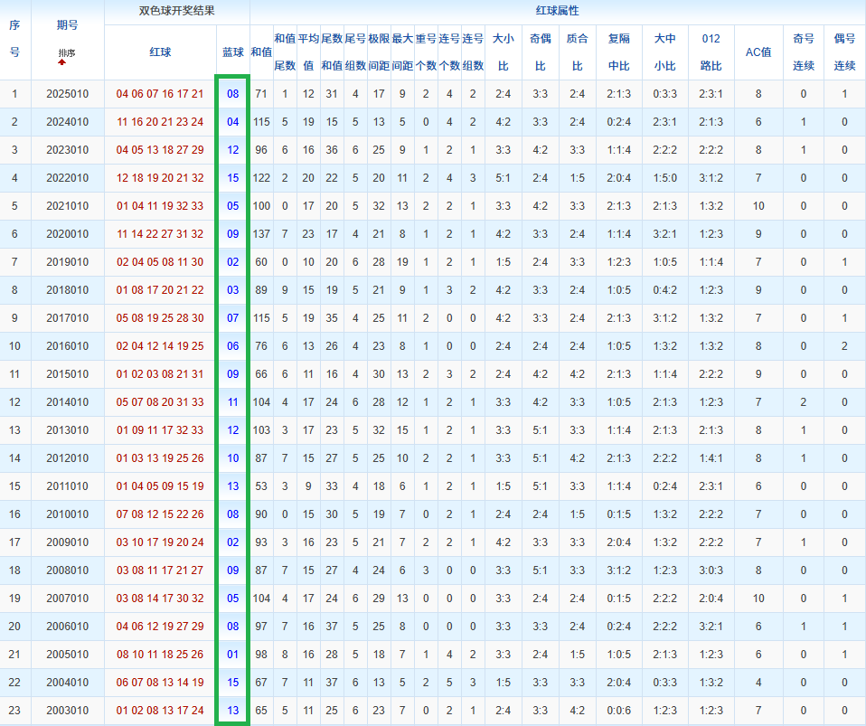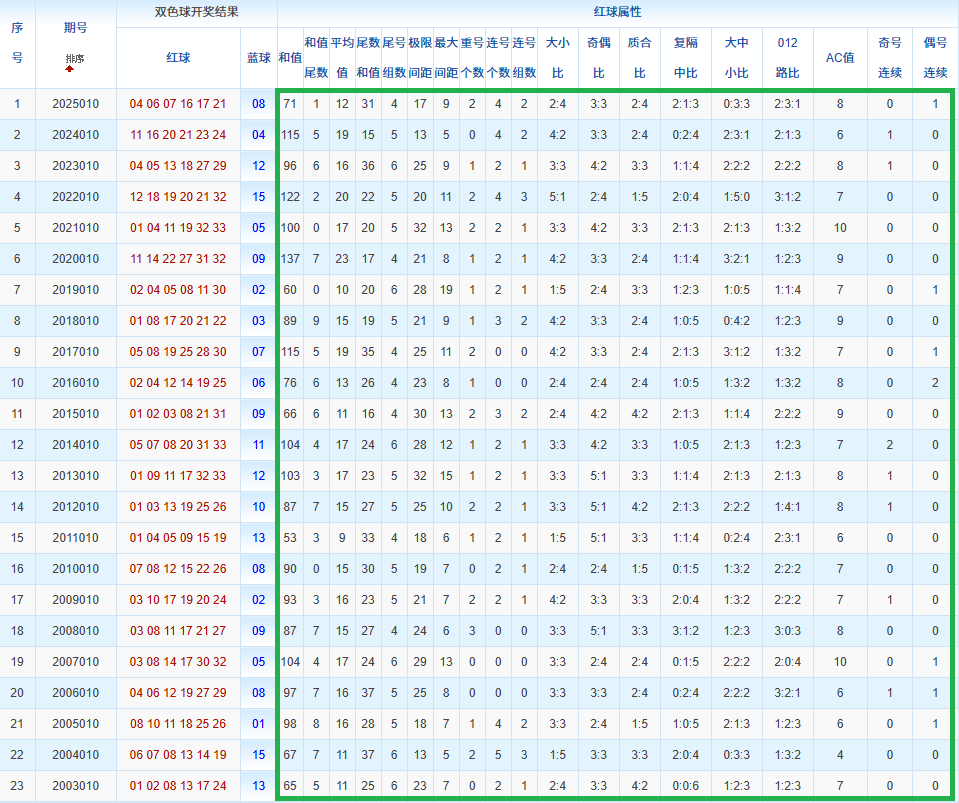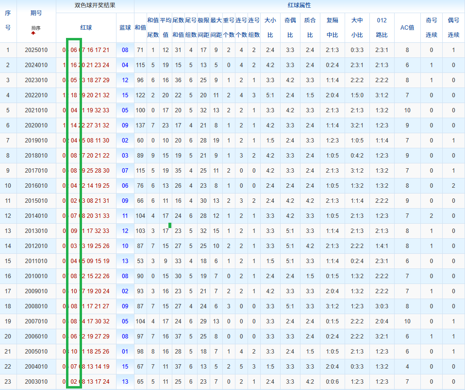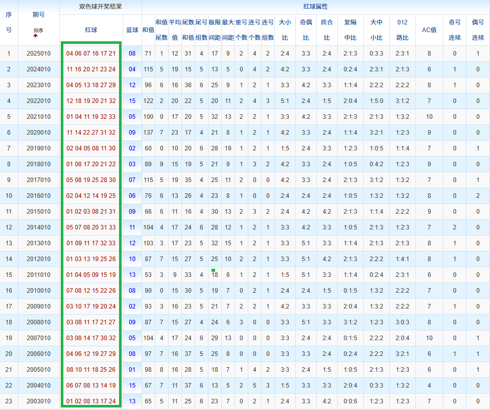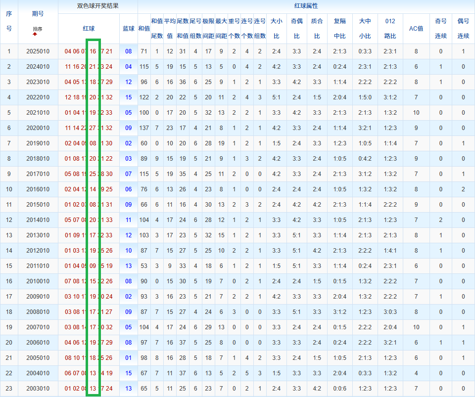 通过观察,我发现双色球往年同期的开奖数据与本期号码之间存在显著关联。具体来说,在红球中,从第一位至第六位,通常会有约4个位置上的数字与往年同期相同位置的号码一致;而蓝球号码中,也有多期开奖结果直接包含了往年同期的数字。因此,我们可以借助往年同期各位置上的号码,作为分析本期开奖情况的重要依据。在此基础上,还可结合往年同期的其他相关条件,进行综合性的号码组合推荐。