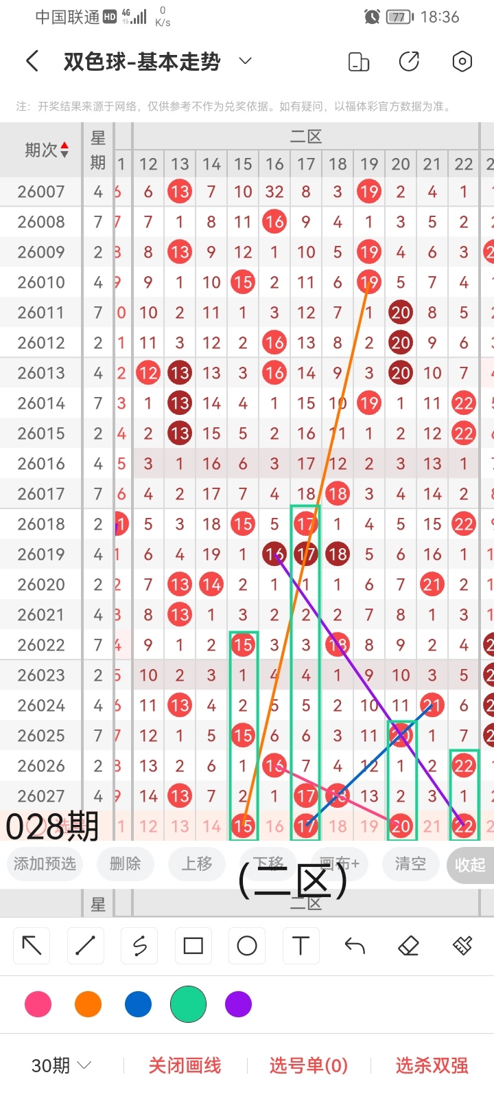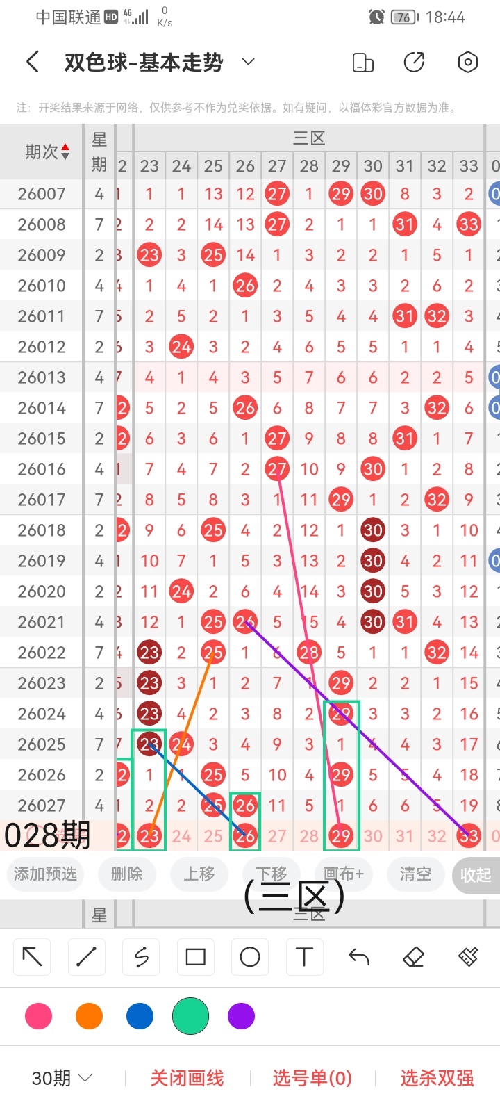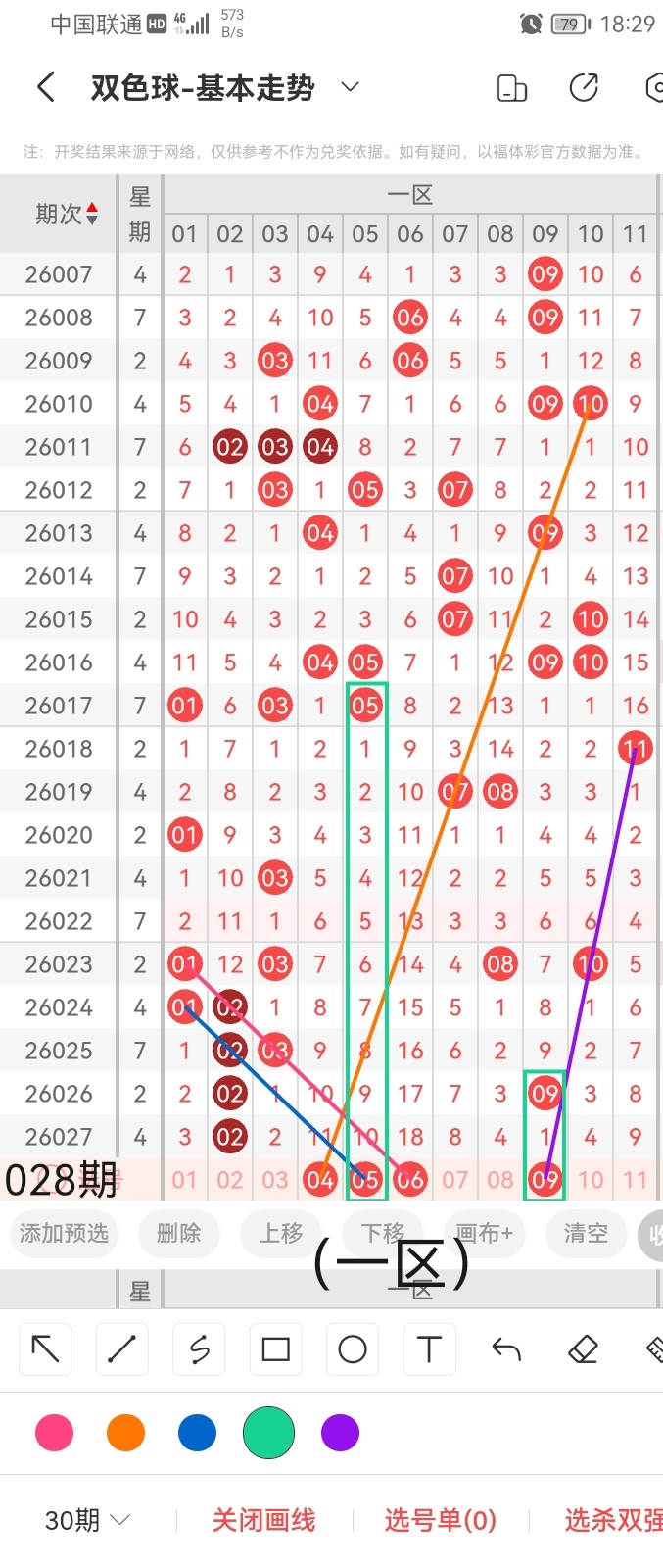 小梁结合上面图中画线思路分析得出,最后给大家汇总提供一下本期红球、蓝球数据,供大家参考: