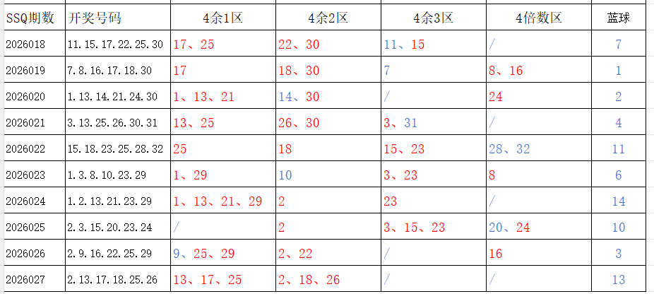 首先看上期回顾,双色球2026027期开奖结果:2.13.17.18.25.26+13其中红球号码开出:4余1区号3个,4余2区号码3个,4余3区号码0个,4倍数区号码0个。蓝球号码:冷号回补。再看上期个人分析:胆尾中出3尾3码!【会员专区】区间热号中出5个!恭喜中出的虹友!