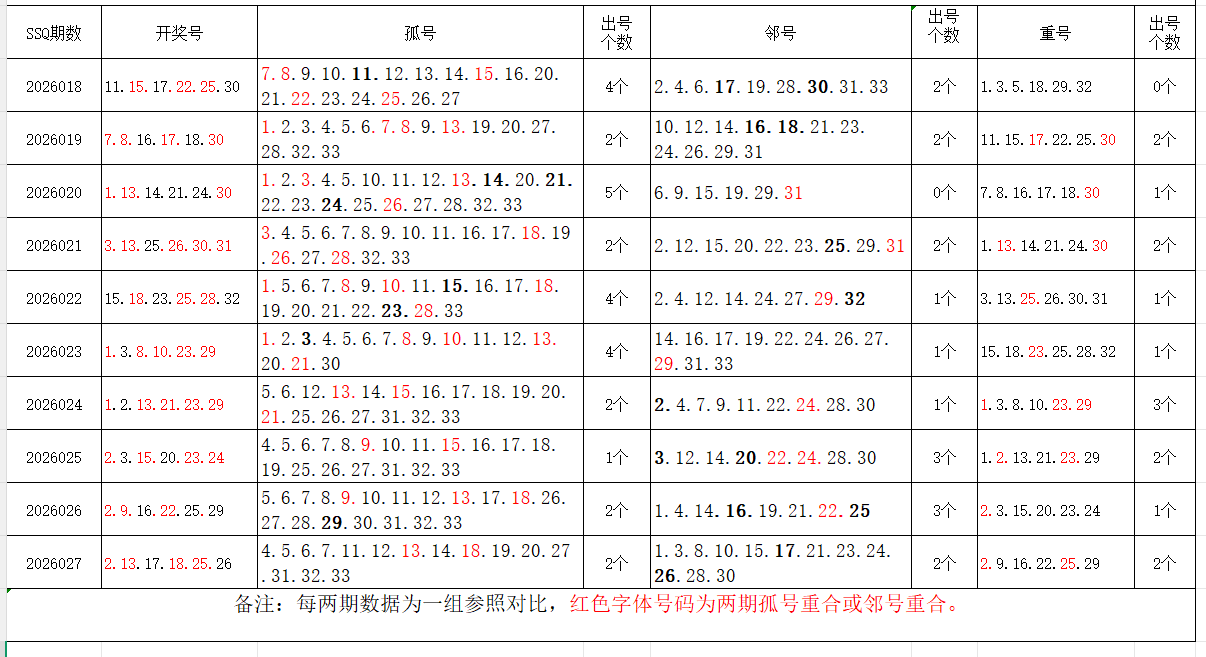 如图,以近两期数据为一组,进行对比分析。相同的孤号、邻号,可能在下期出1-4个左右。上期开出孤号2个,邻号2个,重号2个。本期参考孤号:4.5.6.7.8.9.10.11.15.20.21.22.23.28.29.30.31.32.33;邻号:1.3.12.14.16.19.24.27;孤、邻号重合号码精选:***(会员专区可见)。个人分析,仅供参考。