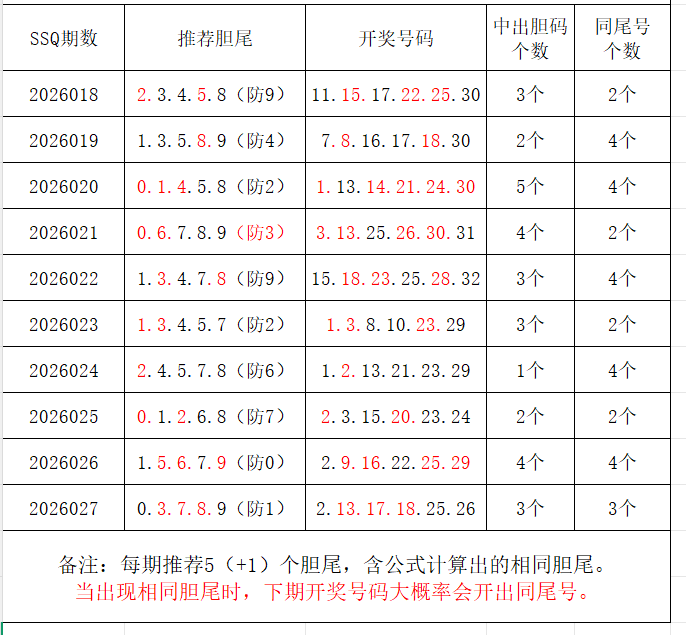 如图,每期推荐胆尾中出1-4个。上期推荐胆尾中出3尾3码!推荐胆尾是按照公式计算的顺序,不定位红球号码的顺序。本期推荐胆尾:0尾/8尾/9尾/2尾/1尾  。加推重点胆尾:***(会员专区可见)。推荐胆码号码:***(会员专区可见)。个人分析,仅供参考。