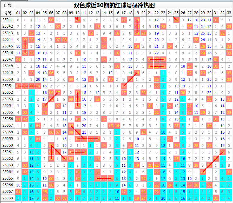 双色球069期冷热号码及出号趋势分析(具体号码可参见上图或会员文章的觅宝图):