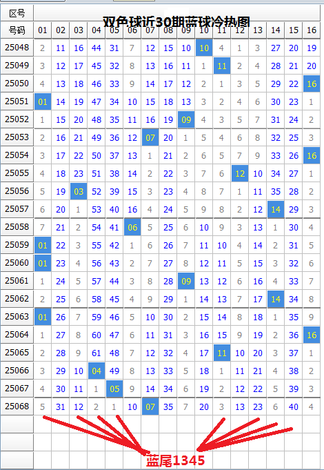 蓝球本期有热蓝8枚,冷蓝8枚,蓝球冷热码数量一样。上期开出冷蓝,这是连续4期开出,由于近期蓝球冷热规律紊乱,本期蓝球冷热难定。