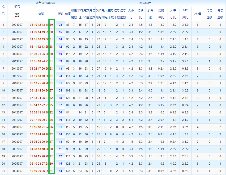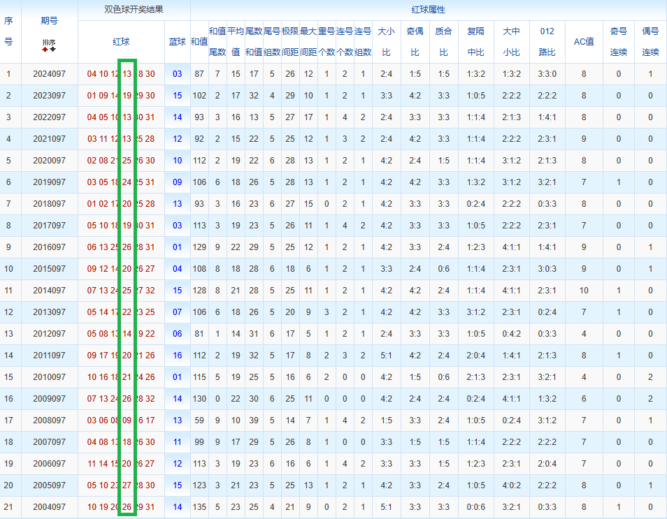 往年同期中选取出现次数靠前的数作为我们的分析对象,其数据有:26 13 30 25 10 05 等