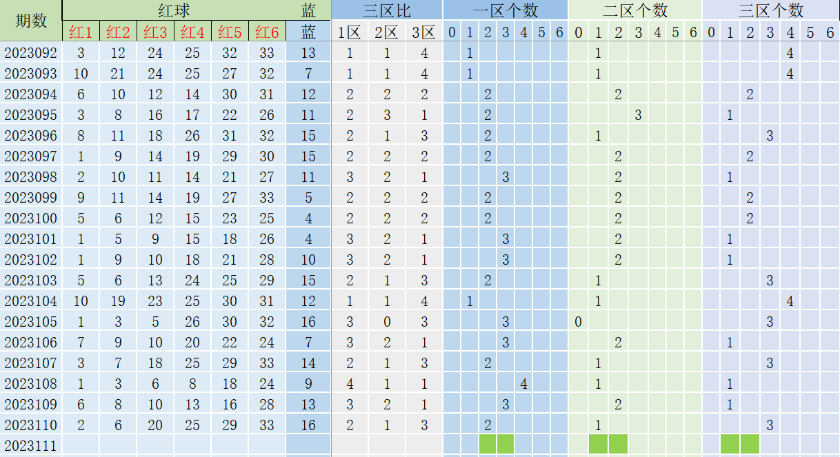 从上述红球三区区间比趋势图可以看出:一区近10期内出号2-3个居多,上期出号2个,而近期出号2个的,下期容易连开或开出3个;二区近期出号1-2个较多,出号1个的,下期一般会连开1个或开出2个;三区近期大致在1-3个间波动出号,出号3个的一般不会连开,上期开出3个号码,则本期应该不会继续开出3个。故本期红球区间比看好2:2:2,防3:2:1。