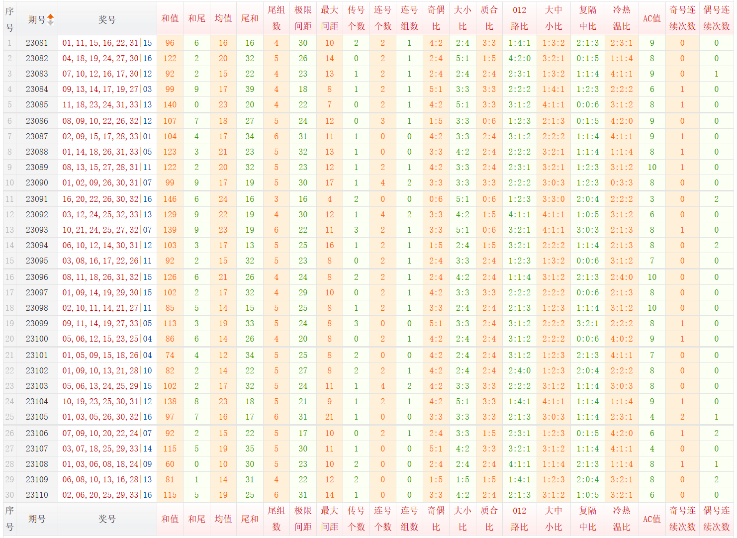福彩双色球-第2023110期开奖号码为:02-06-20-25-29-33+16,和值为115,红球首尾间距为31,红球三区比2:1:3,红球质合比为2:4,红球奇偶比为3:3,012路比2:1:3,第2023110期蓝球开出号码为16,为偶数、大数、合数、1路。近30期开奖综合指标情况汇总,如下图所示: