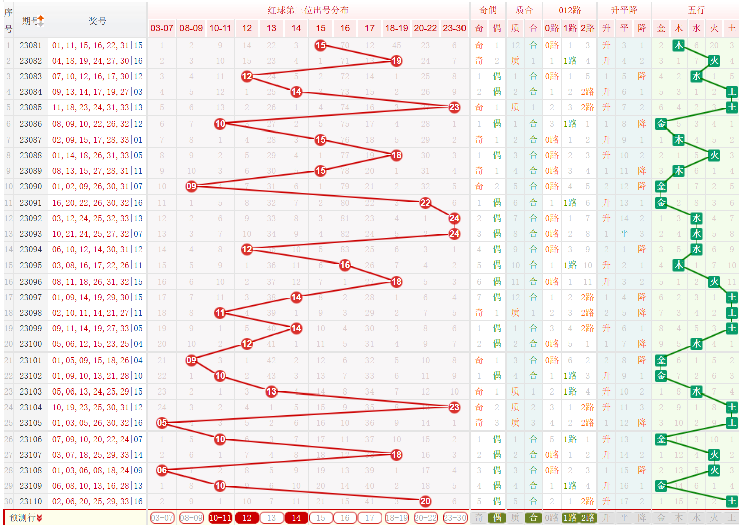从红球第3位质合属性来看,近10期内合数开出7期,质数仅开出3期,合数号码热开,本期主要考虑合数出号;从奇偶属性来看,近10期内偶数出号数量多于奇数,偶数号码出号机率高于奇数;因此本期第3位应该为偶数、合数号码。符合条件的有10-12-14。