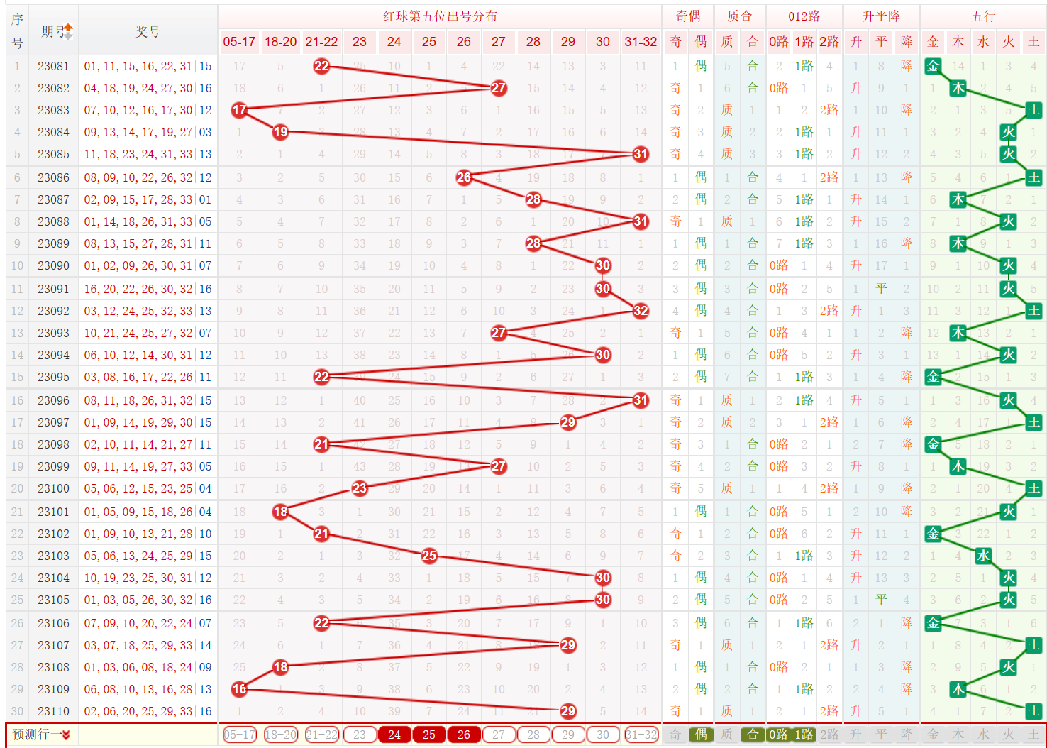 从第5位出号分布图可以看出,第5位出号在22-31之间比较常见。上期红球第5位出号29,为奇数、质数、2路号码。