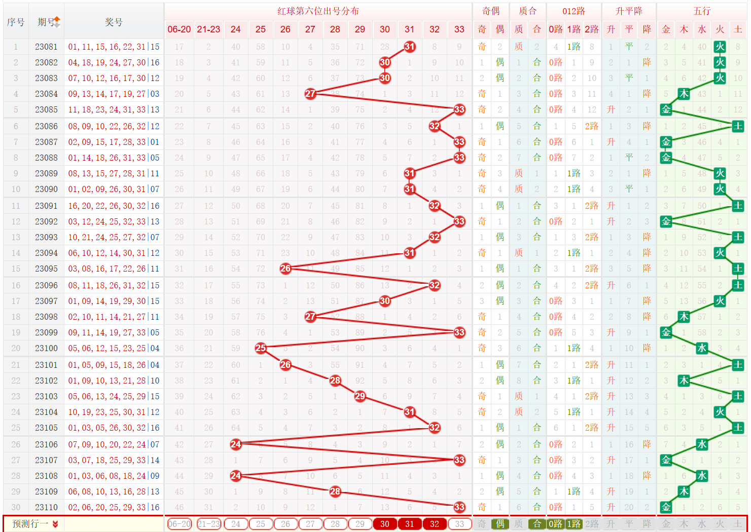 从红球第6位出号分布图可以看出,第6位出号在26-33之间比较常见,上期开出号码为33,为奇数、合数、0路号码。