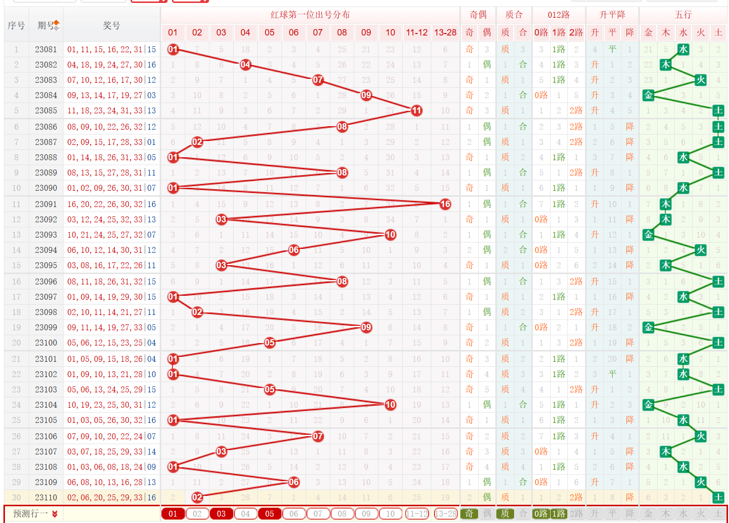 从红球第1位出号分布图可以看出,第1位出号经常落在01-10之间。上期开出02,为偶数、质数、2路号码。