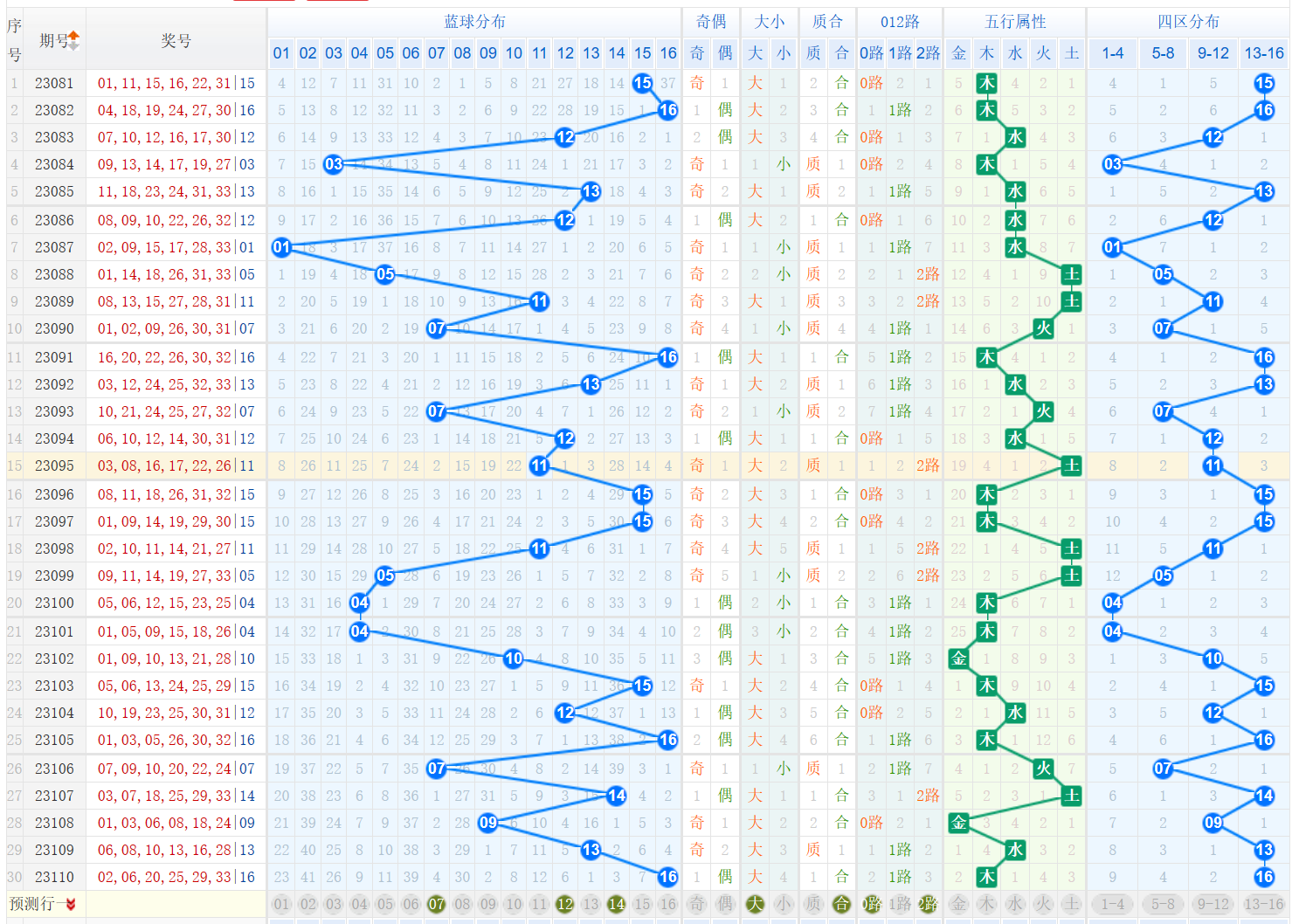 上期蓝球开号码为16,为偶数、大数、合数、1路号码。