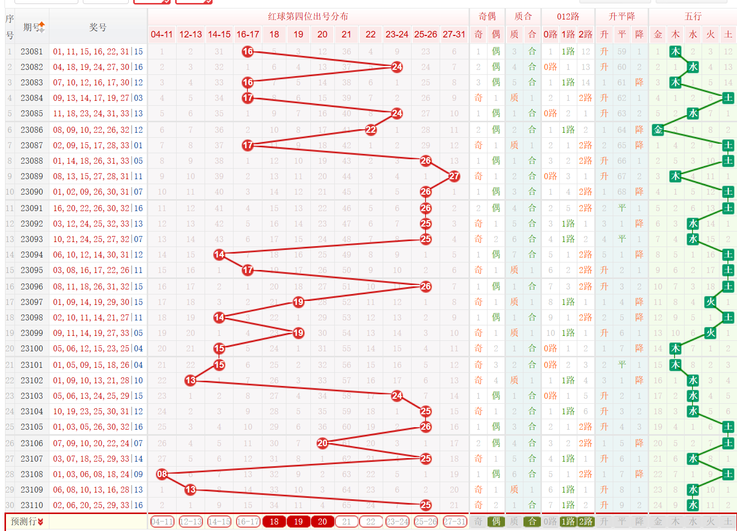 从第4位出号分布图可以看出,出号范围在14-26比较常见。上一期红球第4位开出号码为25,为奇数、合数、1路号码。