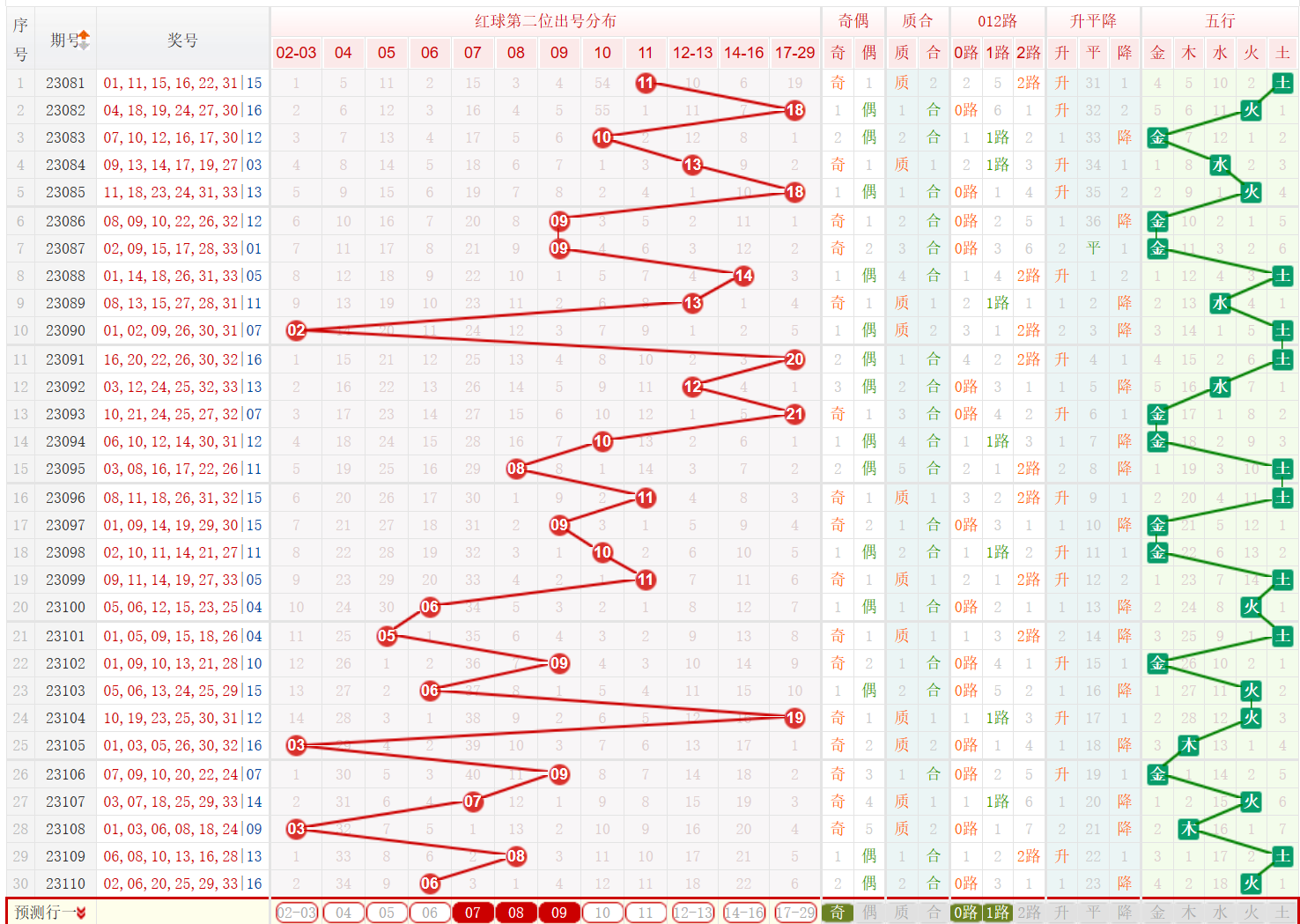 从第2位出号分布图可以看出,第2位出号在03-15之间比较常见。红球第2 位上期开出号码为06,为偶数、合数、0路号码。