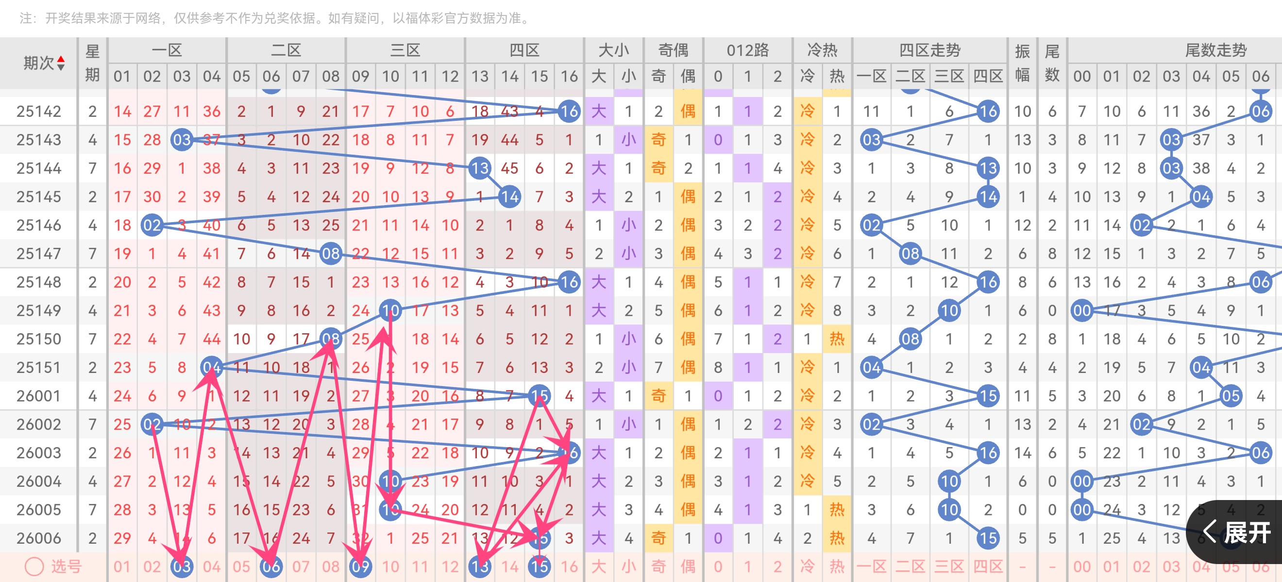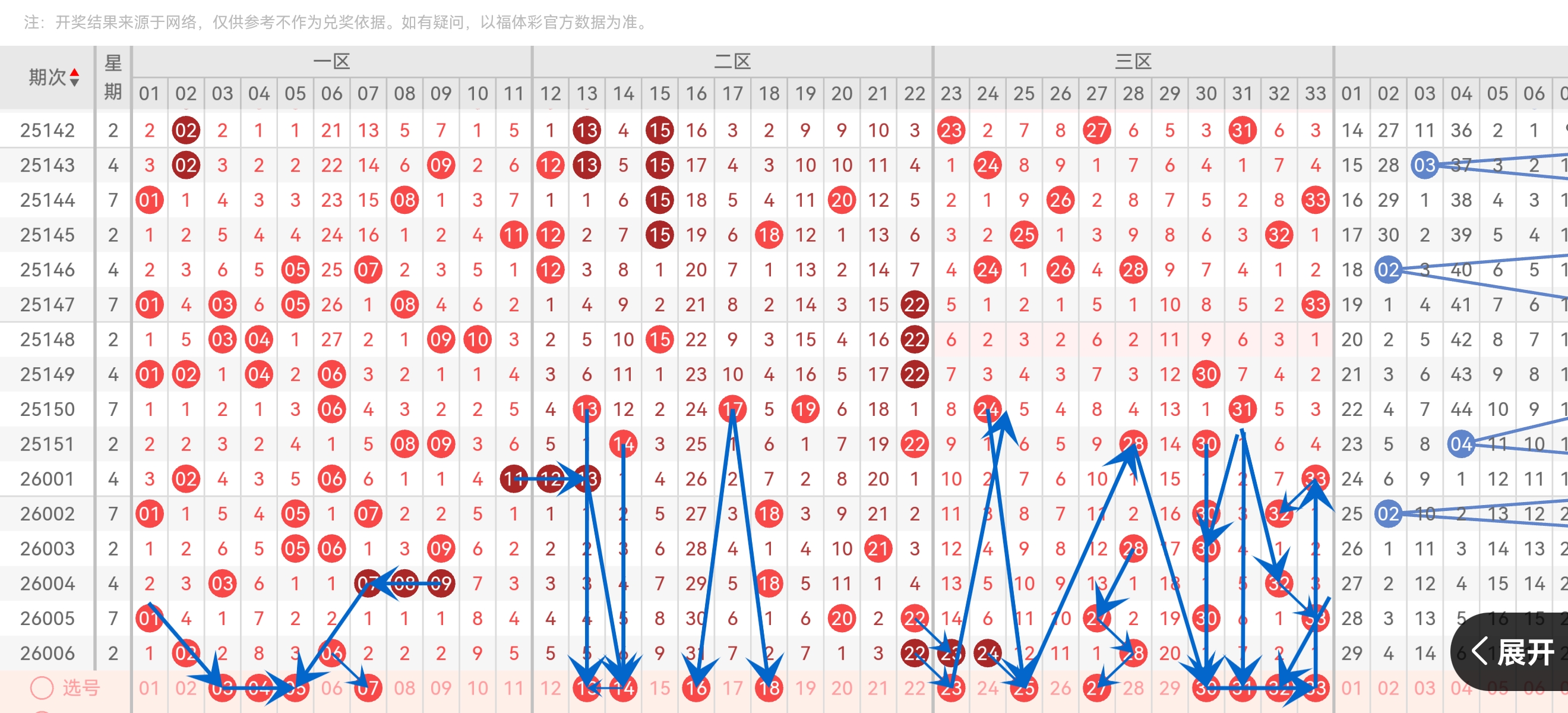 上期三连号(22-23-24),本期防 1区(03-04) 或 3区(30-31) 。