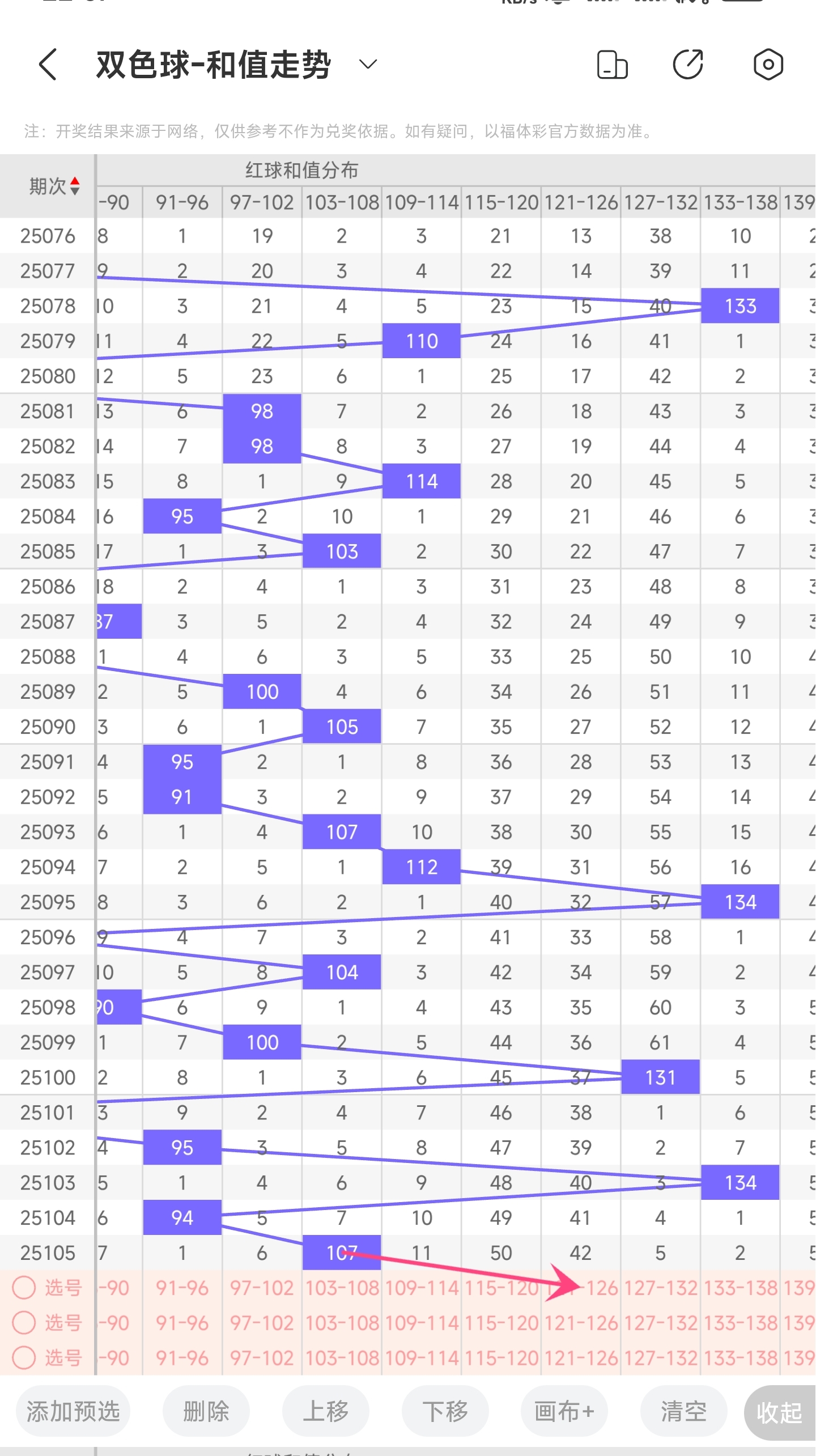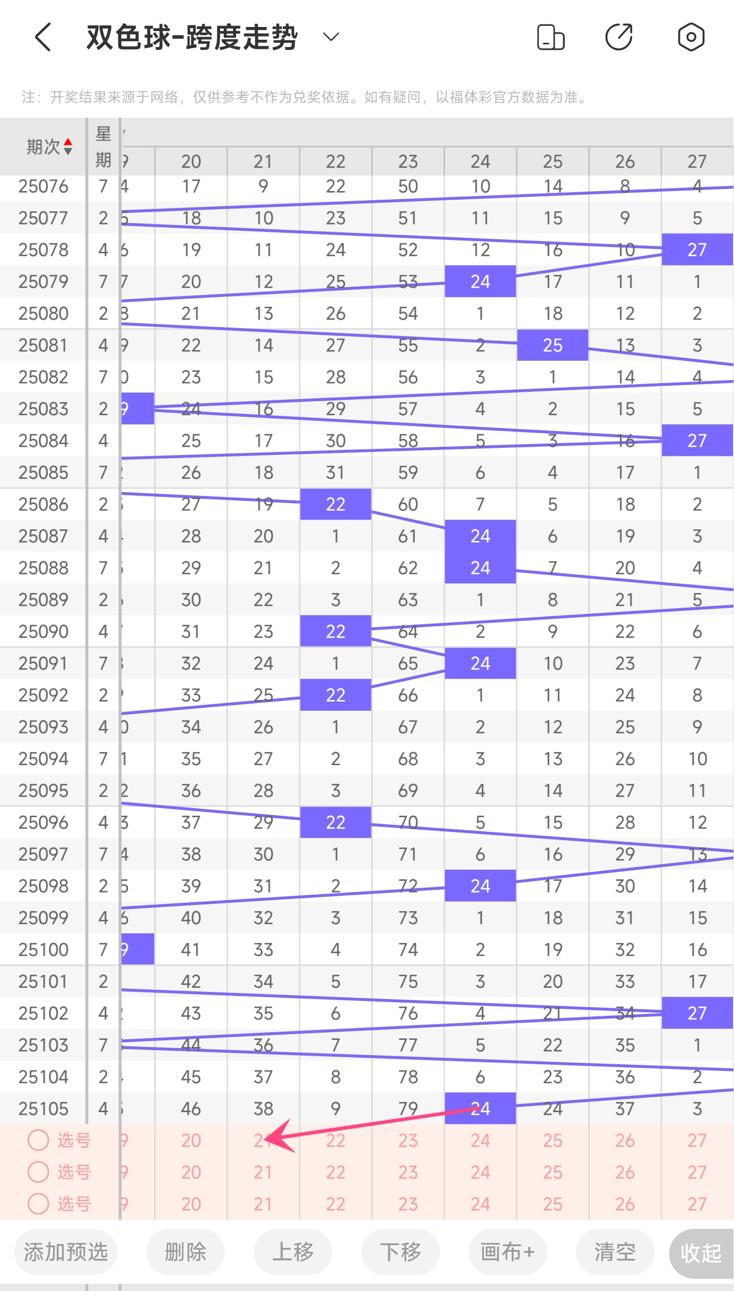 上期龙头为04,凤尾为28,跨度为24,往前一期跨度是30,偏移量为624跨度值是30期内开出较大的跨度值。上升空间是要比下降空间要小一点的。所以推测本期跨度有较大概率是会继续变小,趋势往左,小概率往右,跨度变大。