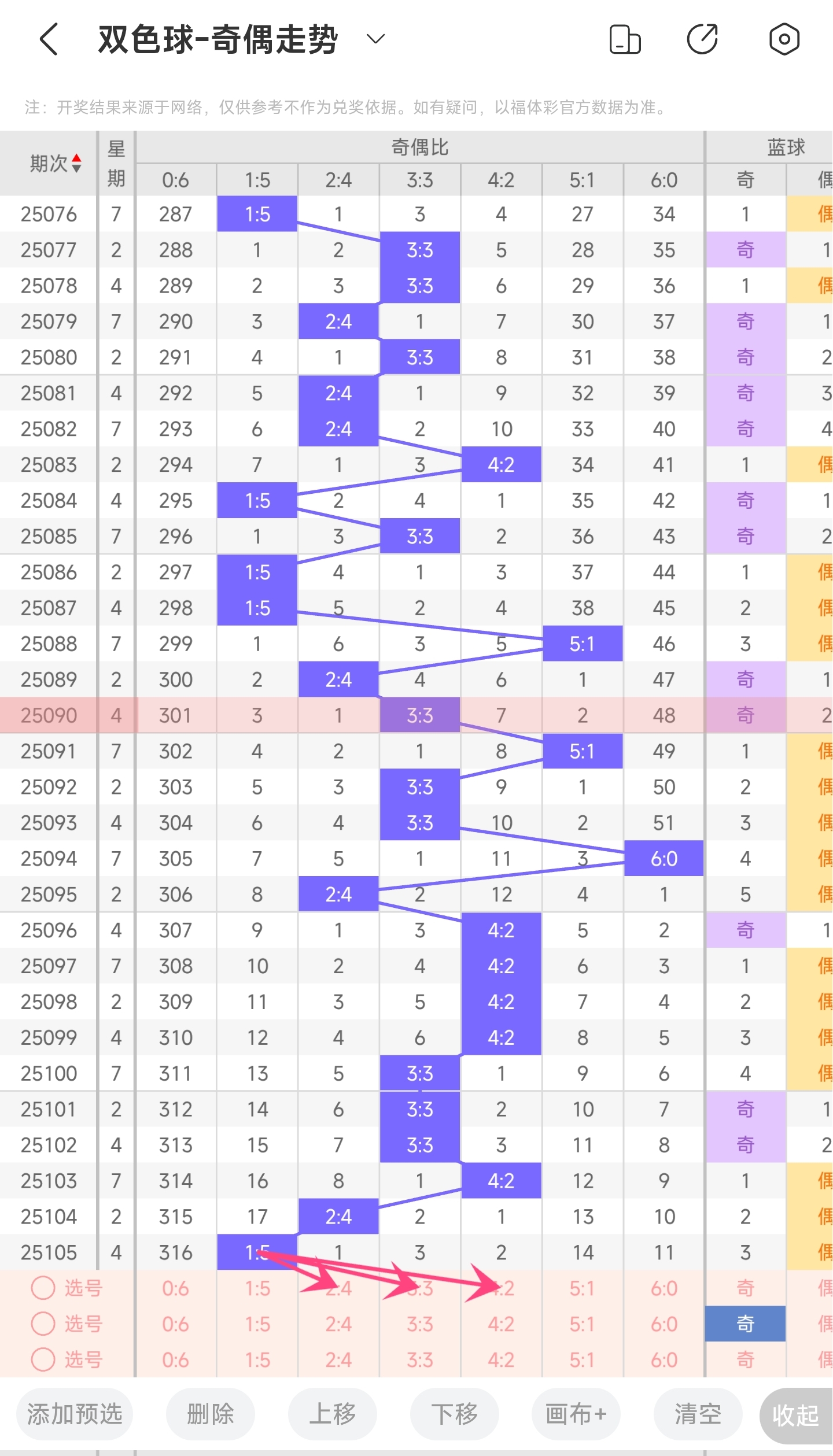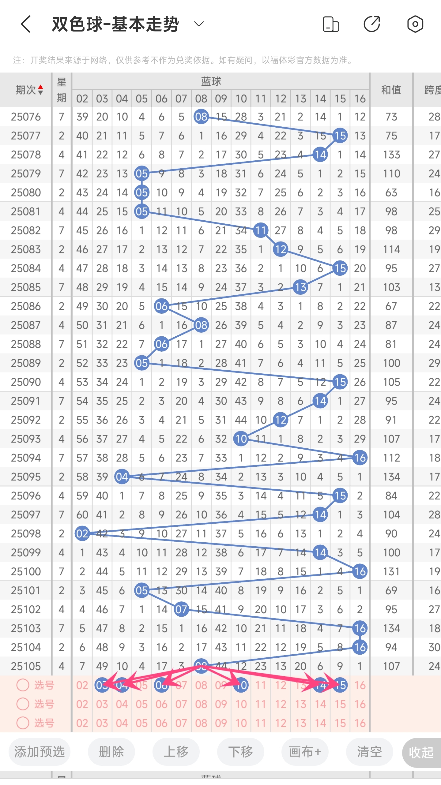 上期开出的是08,往前一期开出的是16。趋势往左偏移,偏移量为8。通过分析目前蓝球的走势图,目前的趋势是可能往左也可能往右的。再结合最近几期的蓝球走势,大多数情况都比较陡,少数是平缓的。所以本期我们主要关注比较大偏移量的号码,其次是小偏移量的号码。再结合遗漏期数,以及冷热号,本期我们可以关注030406101415等号码。综上所述本期推测可能开出030406101415等号码。