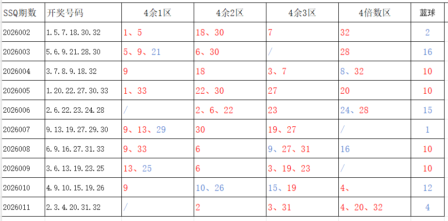 首先看上期回顾,双色球2026011期开奖结果:2.3.4.20.31.32+4。其中红球号码开出:4余1区号0个,4余2区号码1个,4余3区号码2个,4倍数区号码3个。蓝球号码:冷号回补。再看上期个人分析:胆尾中出3尾4码!龙头号码中,红球杀号全中!恭喜中出的虹友!