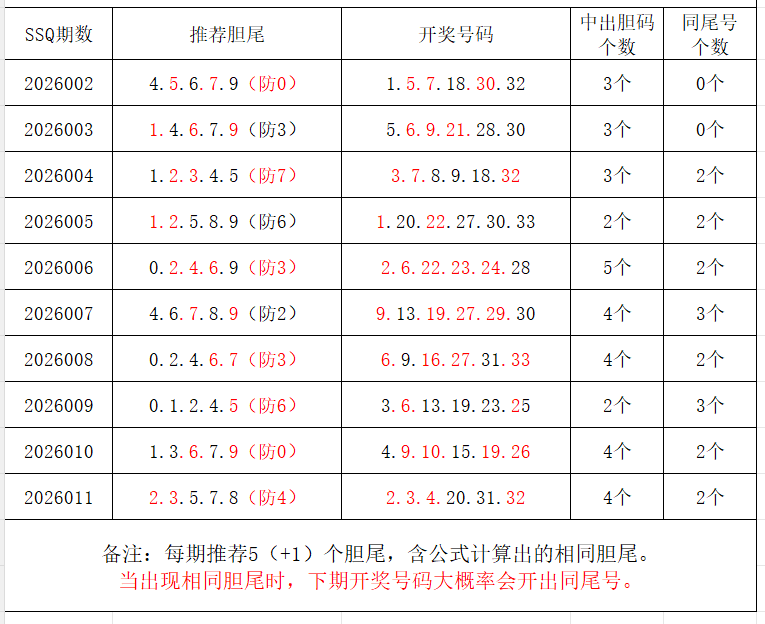 如图,每期推荐胆尾中出1-4个。上期推荐胆尾中出3尾4码!推荐胆尾是按照公式计算的顺序,不定位红球号码的顺序。本期推荐胆尾:4尾/5尾/9尾/2尾/6尾 。加推重点胆尾:***(会员专区可见)。推荐胆码号码:***(会员专区可见)。个人分析,仅供参考。