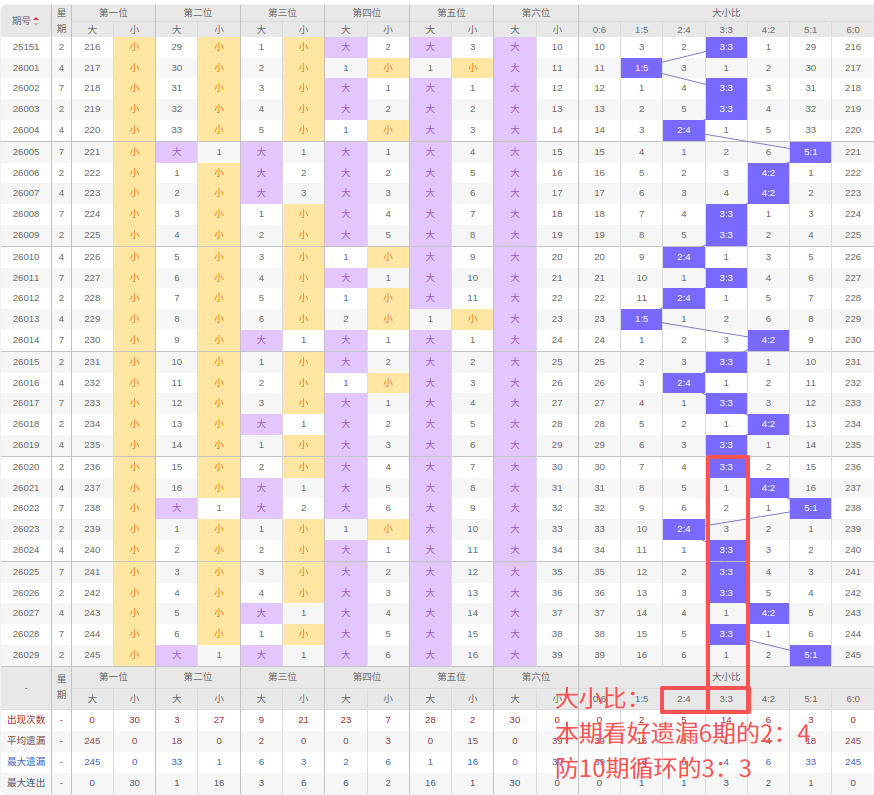 上期大小比:5:1,近10期大小比出现情况:3:3、4:2、5:1、2:4、3:3、3:3、3:3、4:2、3:3、5:1,最近10期出现5期3:3,出现2期4:2,出1期2:4,出现2期5:1,出现0期1:5,出现0期6:0,出现0期0:6,根据近10期规律本期看好遗漏6期开出2:4,防10期循环的3:3,综上所述推荐大小比推荐:3:3,重点关注:2:4。