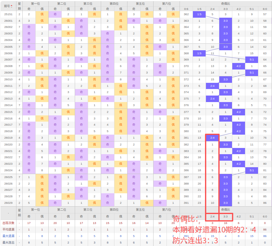 上期奇偶比:3:3,近10期奇偶比出现情况:3:3、4:2、3:3、4:2、5:1、3:3、3:3、3:3、3:3、3:3,最近10期出现7期3:3,出现2期4:2,出现0期2:4,出现1期5:1,出现0期1:5,出现0期6:0,出现0期0:6,根据近10期规律本期看好遗漏10期的2:4,防六连出3:3,综上所述推荐奇偶比推荐:3:3,重点关注:2:4。