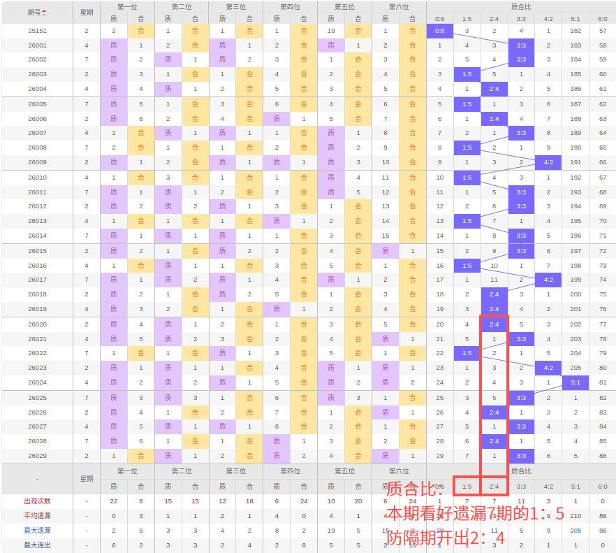 上期质合比:3:3,近10期质合比出现情况:2:4、3:3、1:5、4:2、5:1、3:3、2:4、3:3、2:4、3:3,最近10期出4期3:3,出现1期4:2,出现3期2:4,出现1期5:1,出现1期1:5,出现0期6:0,出现0期0:6,根据近10期规律本期看好遗漏7期的1:5,防隔期的2:4,综上所述推荐质合比推荐:2:4,重点关注:1:5。