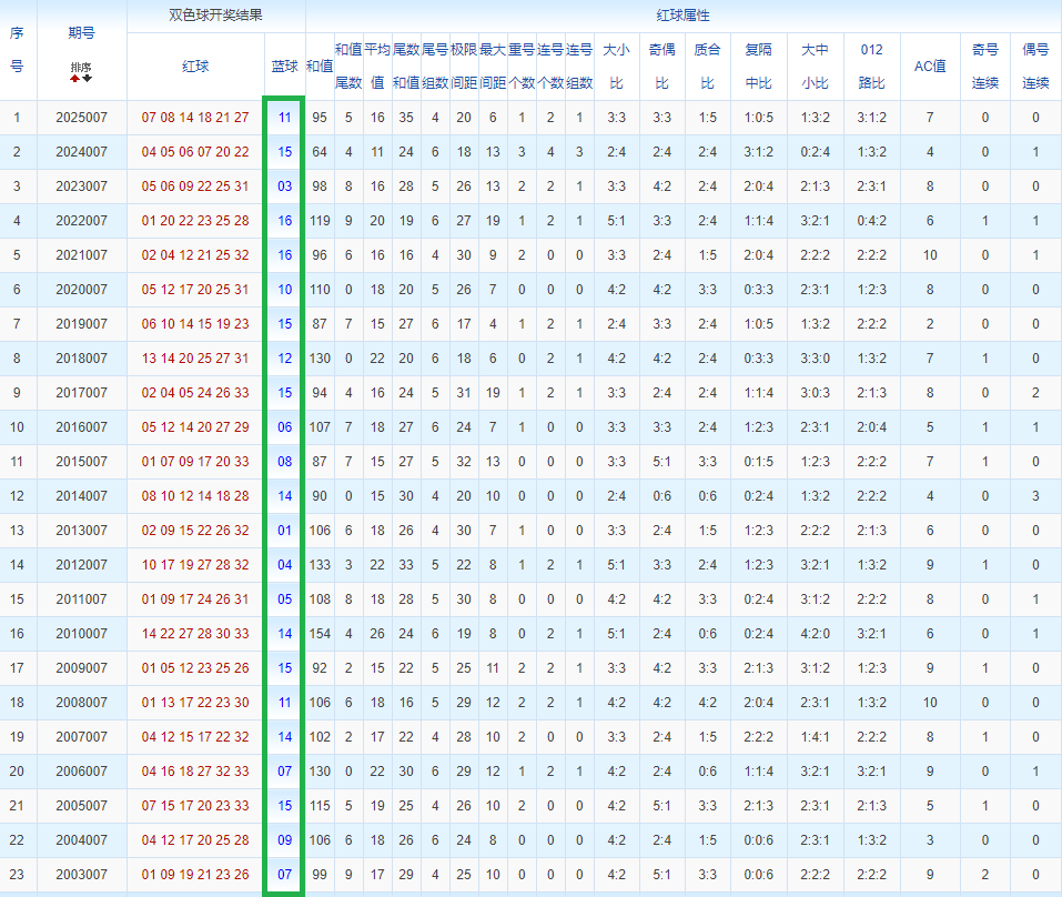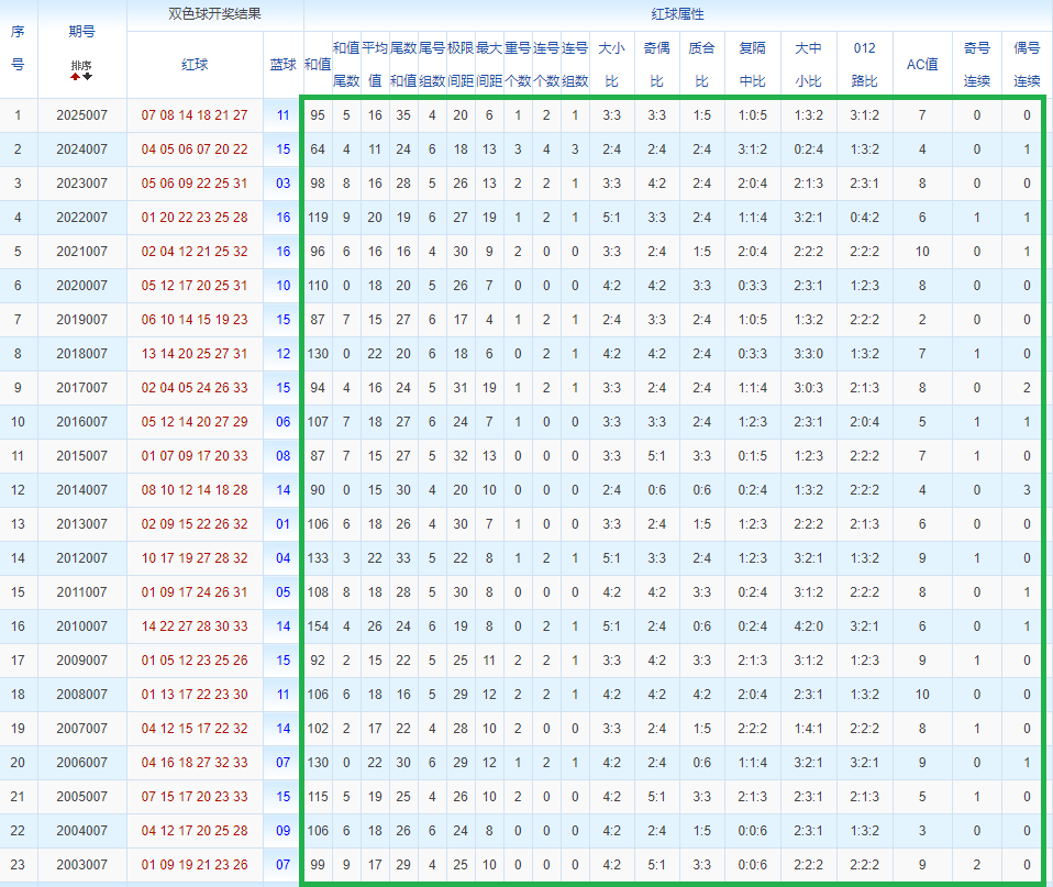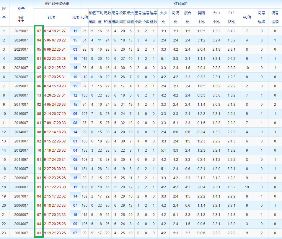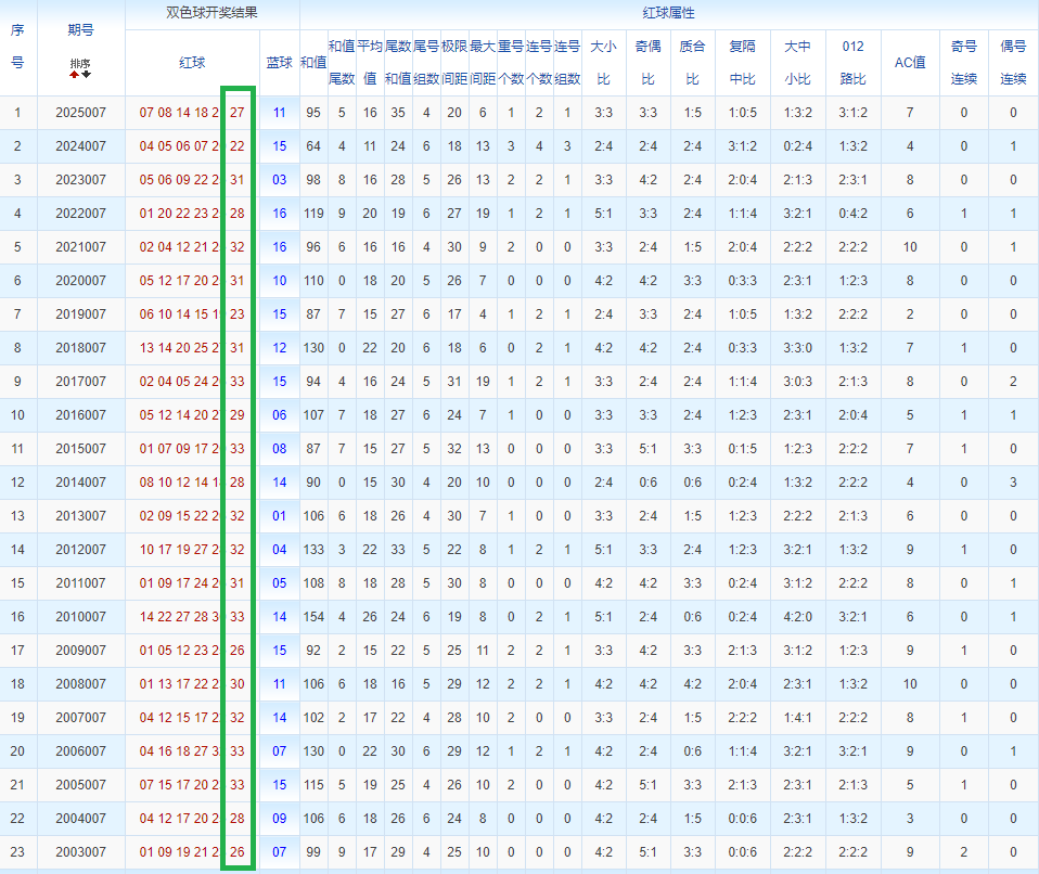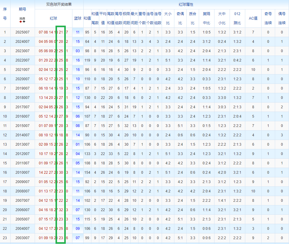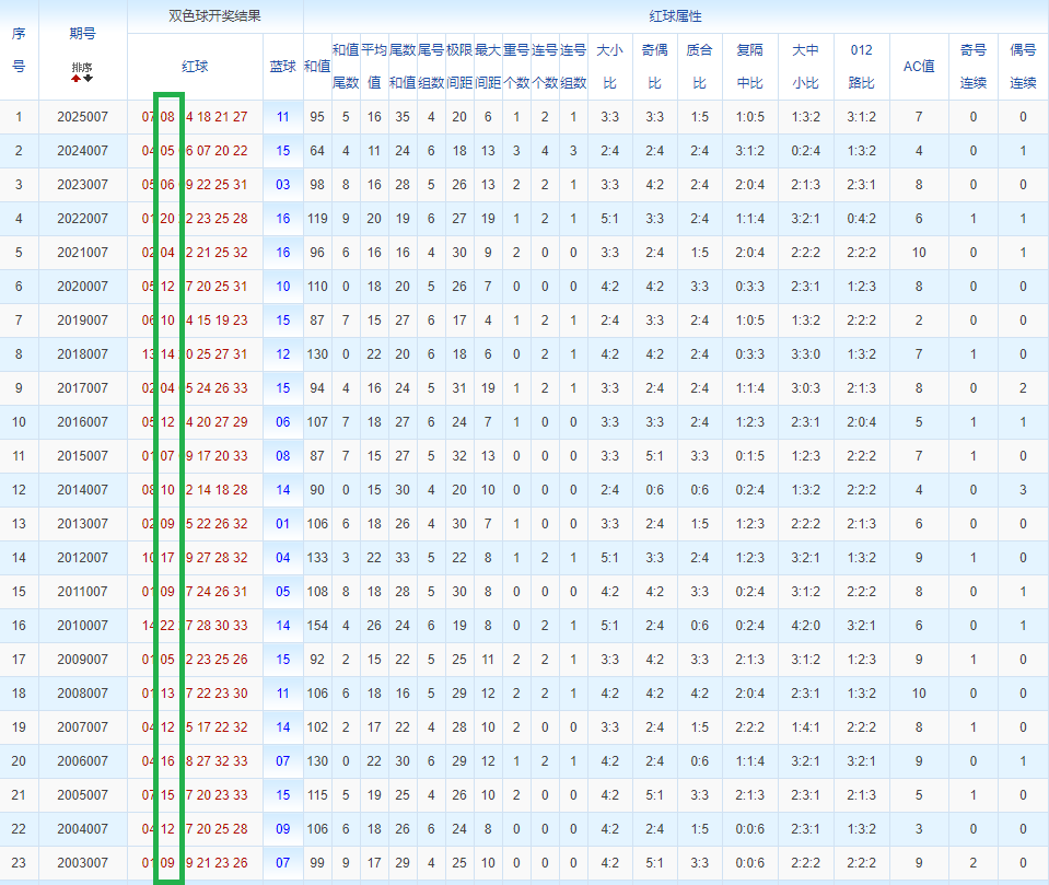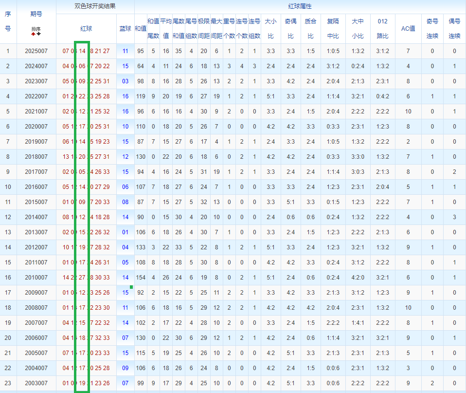 通过观察,我发现双色球往年同期的开奖数据与本期号码之间存在显著关联。具体来说,在红球中,从第一位至第六位,通常会有约4个位置上的数字与往年同期相同位置的号码一致;而蓝球号码中,也有多期开奖结果直接包含了往年同期的数字。因此,我们可以借助往年同期各位置上的号码,作为分析本期开奖情况的重要依据。在此基础上,还可结合往年同期的其他相关条件,进行综合性的号码组合推荐。