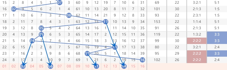 近6期蓝球号码开出04、05、10、13、16号码,通过走势图及奇偶分析,本期推荐关注03、06、11、14等号码。