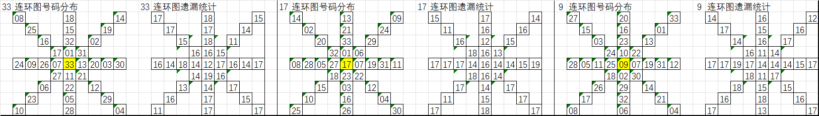 由于数据量大,不一一统计,下图为各个号码分别在33、17、9连环图上的遗漏统计汇总图: