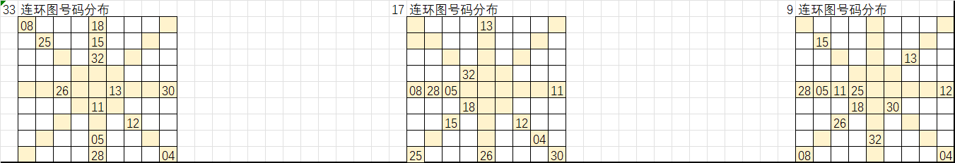 以上是遗漏大于16的号码分别在33、17、9连环图的分布,按照九转连环图选号规律,选取这些号码“环上”和“轴上”的相邻号码作为胆码,把这些胆码进行次数统计即可形成我们组号的排序,从出次多到少进行取号得出我们的大底。