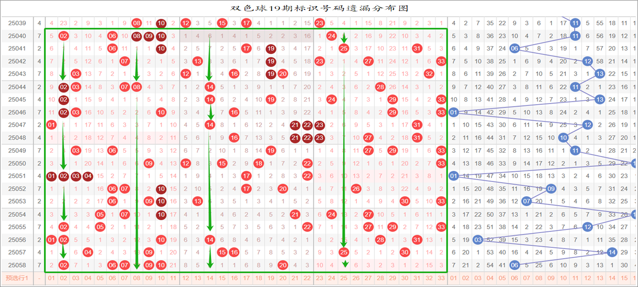 双色球第2025059期组号,去除上期统计排序同位置号码得出: