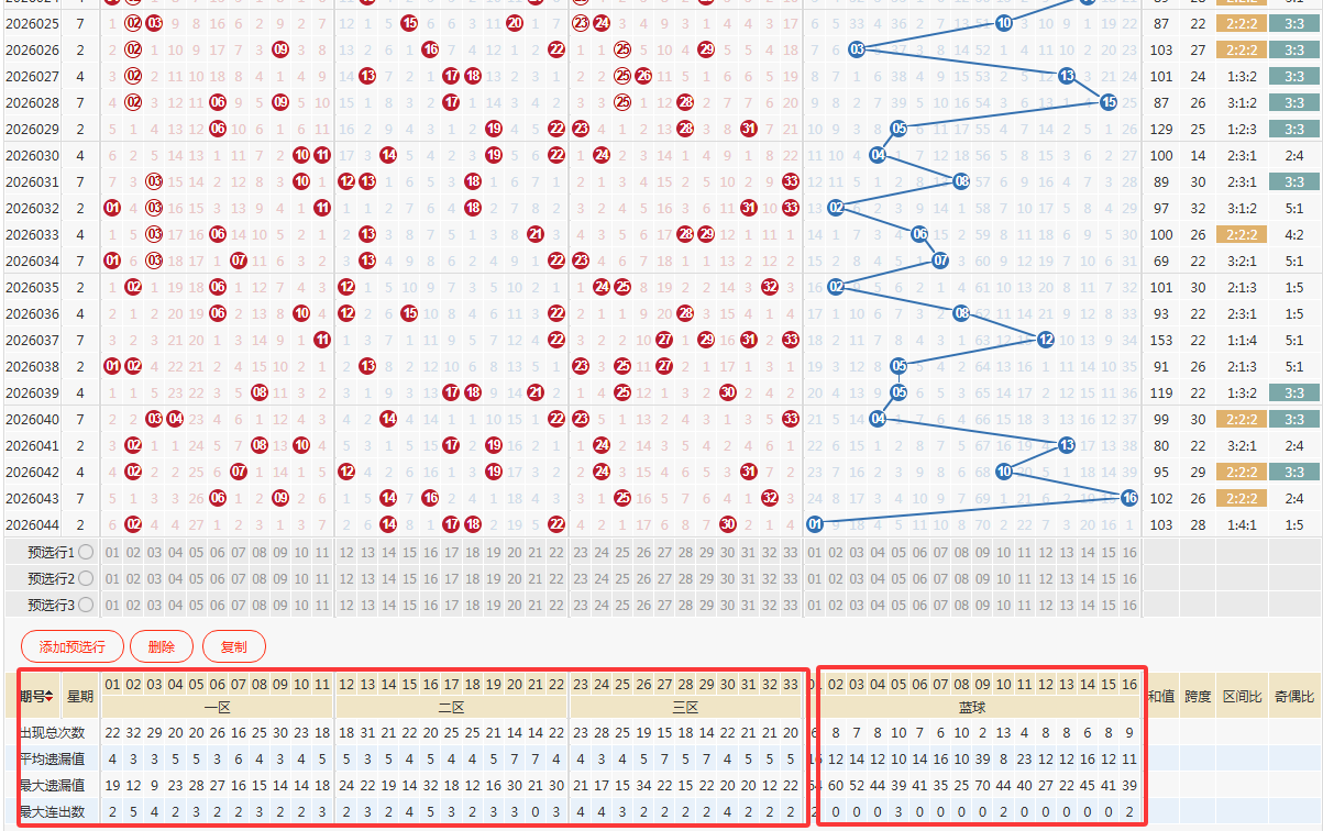 第二步:取近百期数据定后区预选号5码和杀号8码