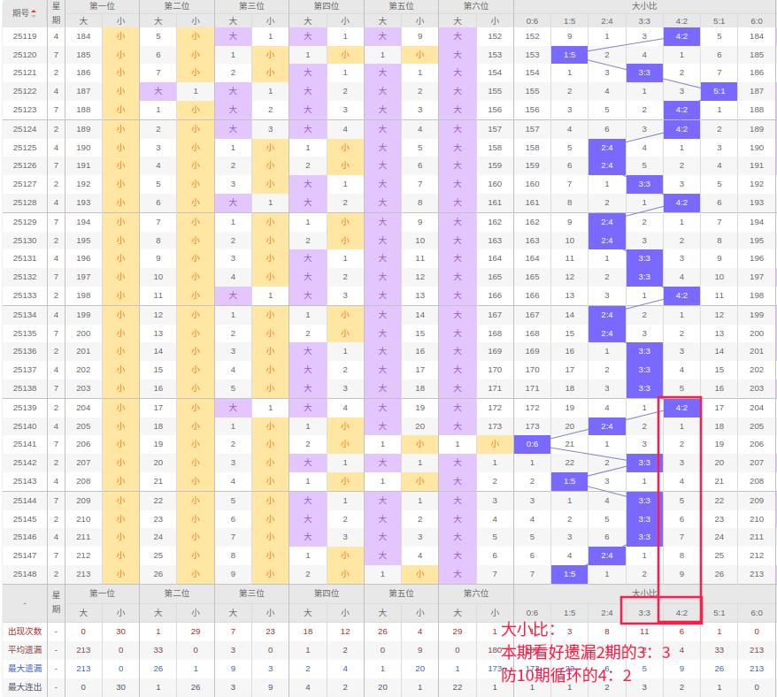 上期大小比:1:5,近10期大小比出现情况:4:2、2:4、0:6、3:3、1:5、3:3、3:3、3:3、2:4、1:5,最近10期出现4期3:3,出现1期4:2,出2期2:4,出现0期5:1,出现2期1:5,出现0期6:0,出现1期0:6,根据近10期规律本期看好遗漏2期的3:3,防10期循环的4:2,综上所述推荐大小比推荐:4:2,重点关注:3:3。