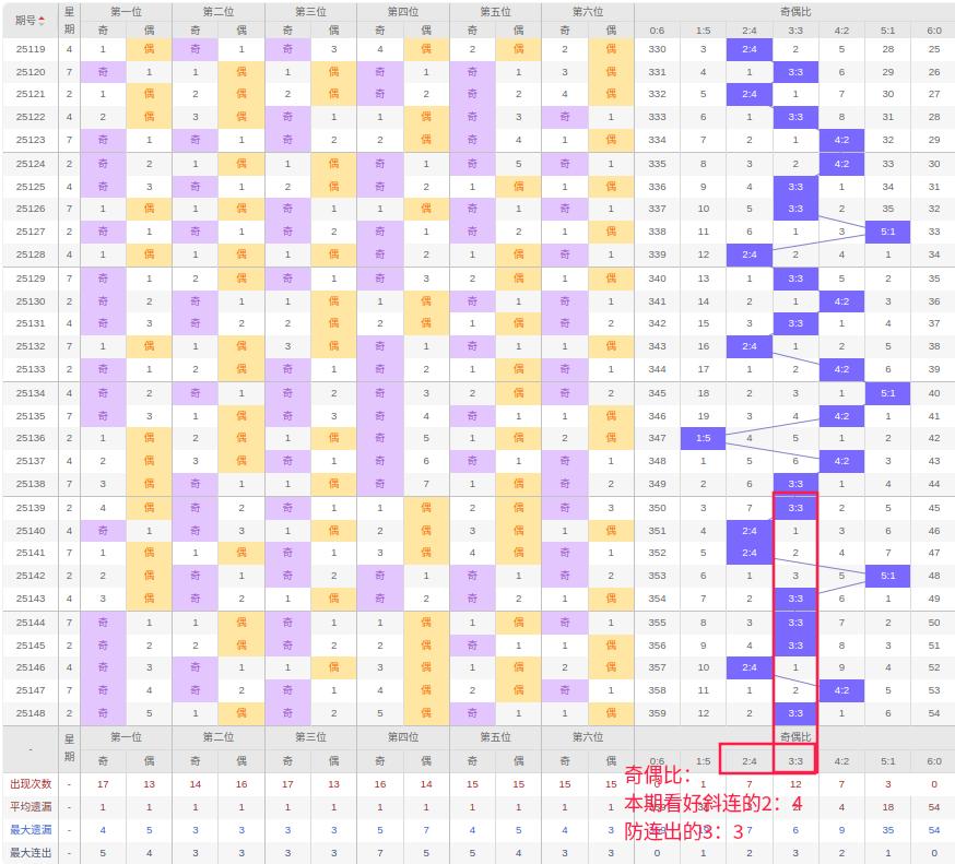 上期奇偶比:3:3,近10期奇偶比出现情况:3:3、2:4、2:4、5:1、3:3、3:3、3:3、2:4、4:2、3:3,最近10期出现5期3:3,出现1期4:2,出现3期2:4,出现1期5:1,出现0期1:5,出现0期6:0,出现0期0:6,根据近10期规律本期看好斜连出2:4,防连出3:3,综上所述推荐奇偶比推荐:3:3,重点关注:2:4。