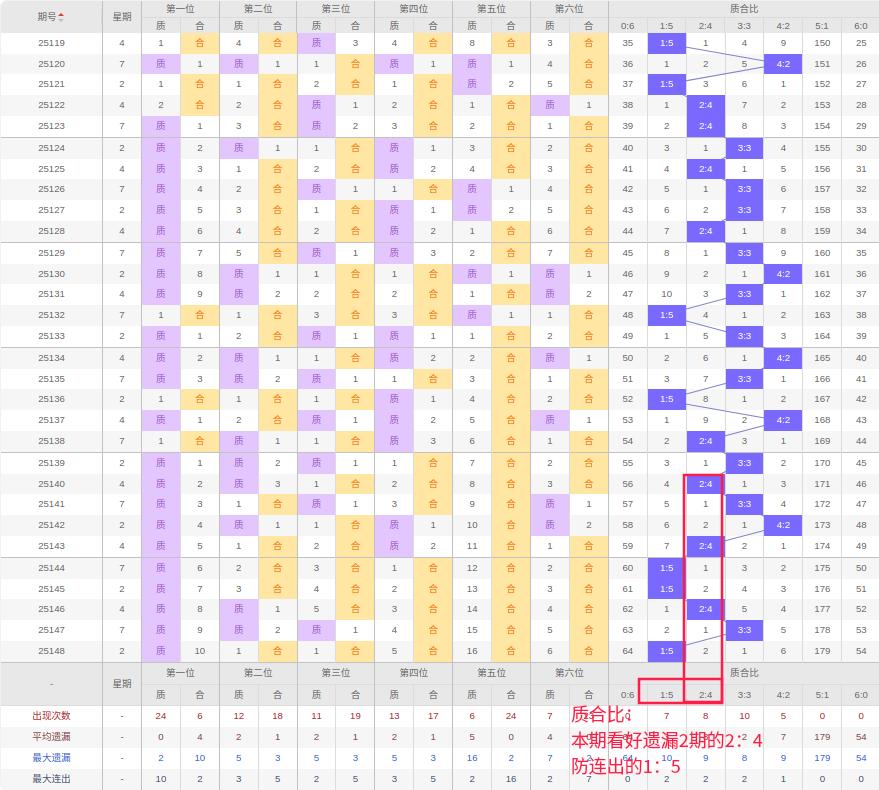 上期质合比:1:5,近10期质合比出现情况:3:3、2:4、3:3、4:2、2:4、1:5、1:5、2:4、3:3、1:5,最近10期出3期3:3,出现1期4:2,出现3期2:4,出现0期5:1,出现3期1:5,出现0期6:0,出现0期0:6,根据近10期规律本期看好遗漏2期的2:4,防连出1:5,综上所述推荐质合比推荐:1:5,重点关注:2:4。
