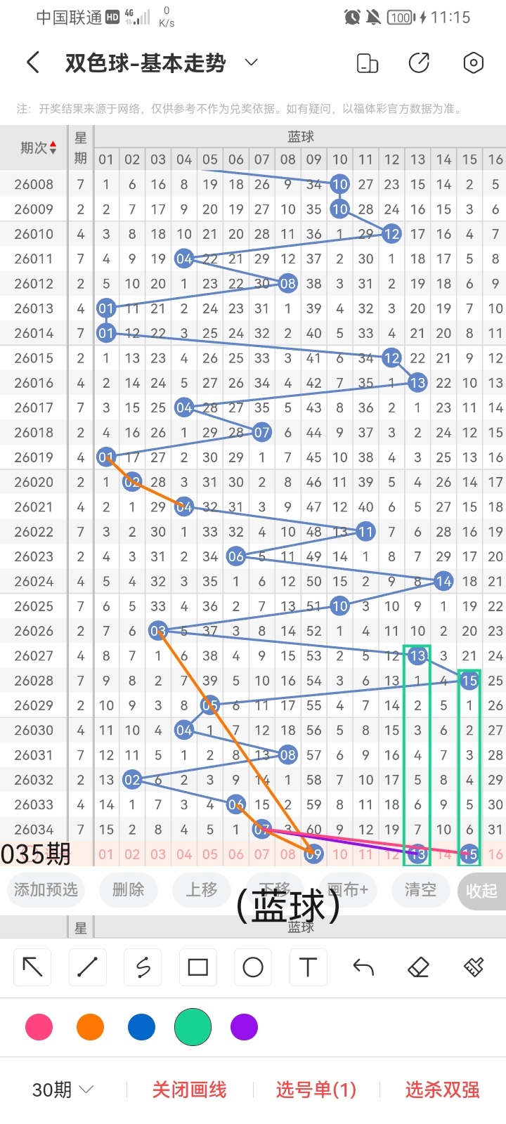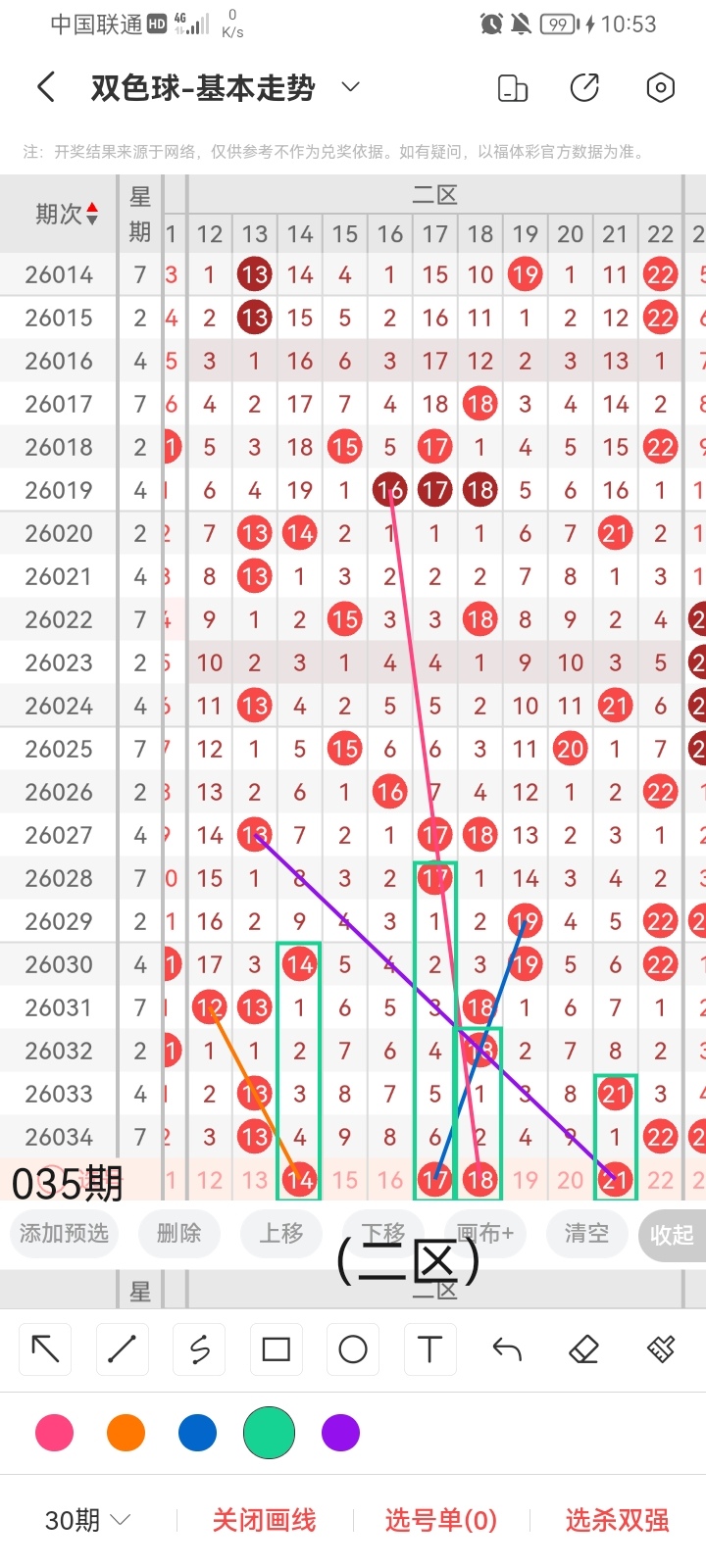 小梁结合上面图中画线思路分析得出,最后给大家汇总提供一下本期红球、蓝球数据,供大家参考: