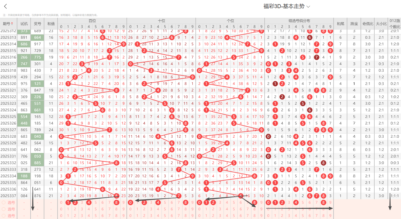 ①百位:上期开出大号奇数5号,在历史开奖记录中显示一般正常的奇偶周期平均在1~3期为普遍现象,上期出现奇偶互变为奇数2路号码,依据奇偶以及012路周期性规律的转变特征点即本期1路号码有开出的趋势2路号码注意预防