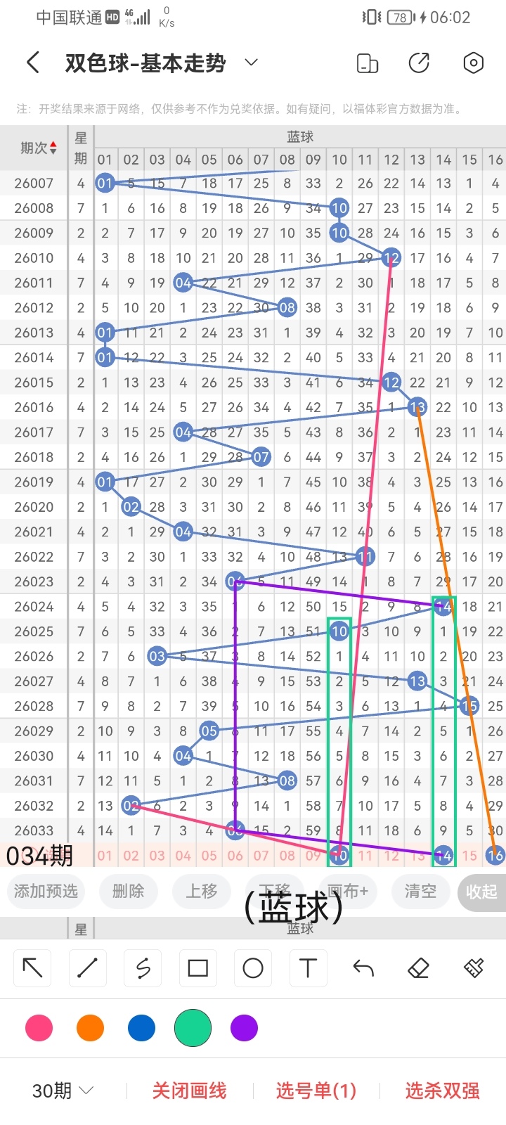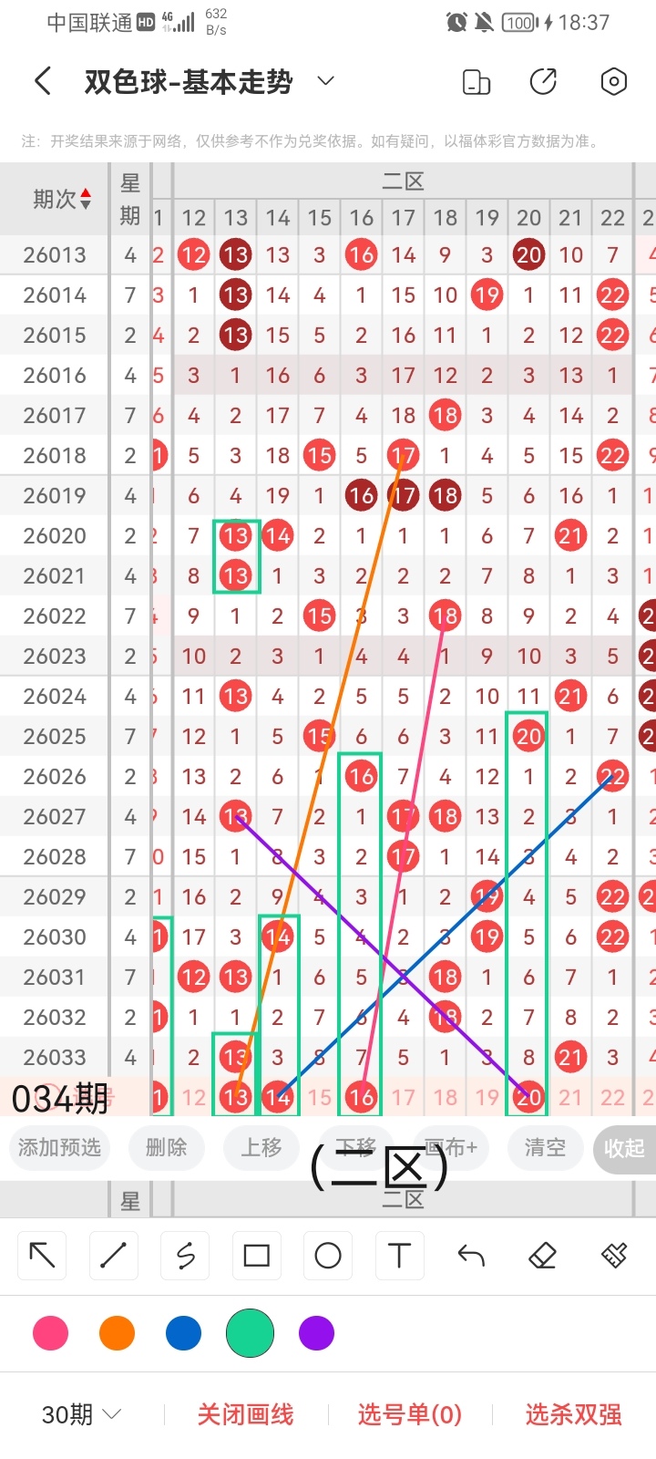 小梁结合上面图中画线思路分析得出,最后给大家汇总提供一下本期红球、蓝球数据,供大家参考: