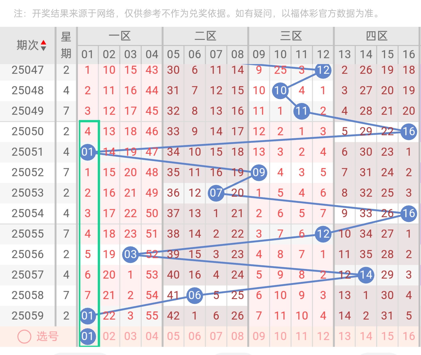 - 12-22(中号):14、16、19、21、23,近期中号区热度回升(如2025041期“06,10,17,19,25,31”)。