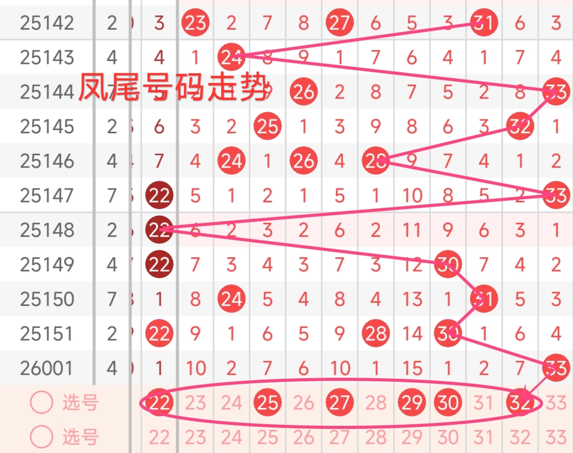 上期凤尾号码为33,振幅上升了3点,开出了奇数号码。回顾近期凤尾号码,振幅波动较大。上期凤尾号码为31,开出奇数号码。观察凤尾号码的走势,凤尾号码在红三区之间较为常见。近期凤尾号码的大小波动不大,近期凤尾号码奇偶号码交替开出。上期凤尾号码开出奇数号码,预计本期凤尾号码可以重点关注偶数号码。根据近期凤尾号码的走势,预计本期凤尾号码可以注意22 - 32区间开出。这些号码在历史开奖中出现频率较高,且符合当前的走势规律。本期还需注意一些连续漏出的冷码有望在本期热出。本期凤尾号码可重点关注22、25、27、29、30、32。