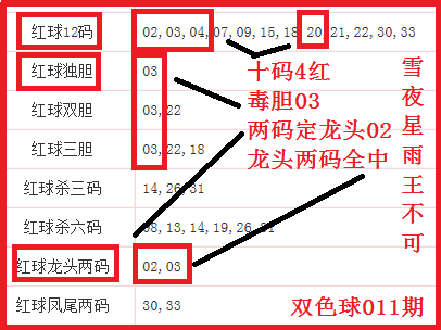 双色球012期,上期毒胆03,十码4红,两码定龙头02,龙头两码02 03全中