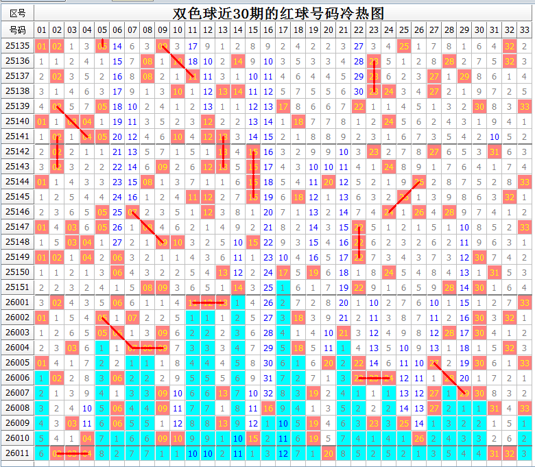 双色球26012期冷热号码及出号趋势分析(具体号码可参见上图或会员文章的觅宝图):