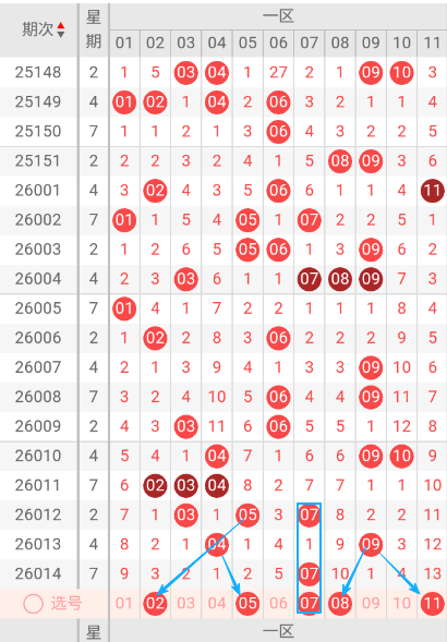 根据走势图可以看出当区段,005期开出01一个号码球 ,006期开出02.06二个号码球 ,007期开出09一个号码球 ,008期开出06.09二个号码球 ,009期开出03.06二个号码球 ,010期开出04.09.10三个号码球 ,011期开出02.03.04三个号码球 ,012期开出03.05.07三个号码球 ,013期开出04.09个号码球 ,014期开出07一个号码球 ,按照如此规律本期当前区判断可能会开出1双1单。我们看下当前区上期没有开出重叠号,那么本期当前区要定重叠号的情况下可关注07号码球。再看下当前区段上期没有开出斜连号,当期选号得留意08斜连号。建议重点关注02.05.07.08.11