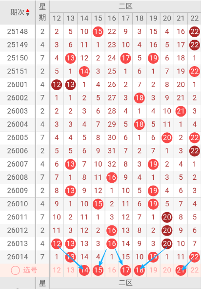 根据走势图可以看出当前区段,004期开出18一个号码球 ,005期开出20.22二个号码球 ,006期开出22一个号码球 ,007期开出13.19二个号码球 ,008期开出16一个号码球 ,009期开出13.19二个号码球 ,010期开出15.19二个号码球 ,011期开出20一个号码球 ,012期开出16.20二个号码球 ,013期开出12.13.16.20四个号码球 ,014期开出13.19.22三个号码球 ,按照如此规律本期当前区可能开出1单1双。我们看下当前区上期开出13重叠号,那么本期当前区要定重叠号的情况下可关注19号码球。再看下当前区上期开出13.19斜连号,当期选号得留意斜连14号码球。本区重点关注14.15.17.18.21