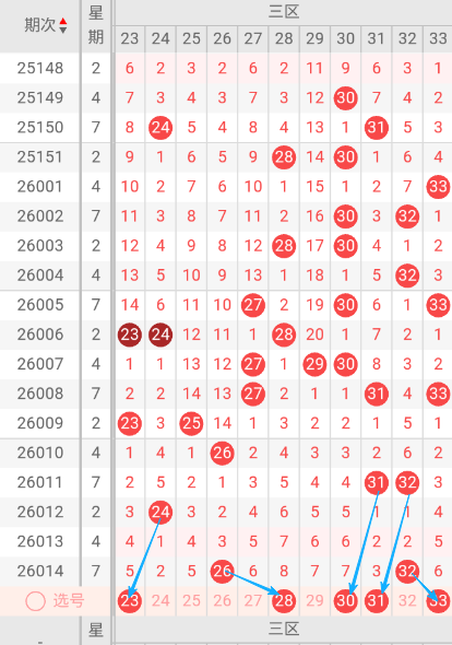 - 2:2:2:三区均衡出号,双色球中出概率最高的区间比