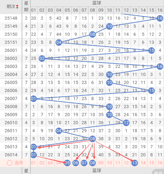 根据走势图近10期的走势看,蓝球在151期开出04蓝球之后,1大1小4大1小3大4小,再看下近10期的蓝球中冷码有回补的趋势,这种趋势规律本期判断极有可能开出单号,本期防蓝球12双号,蓝球本期重点关注05,06,07,08,13