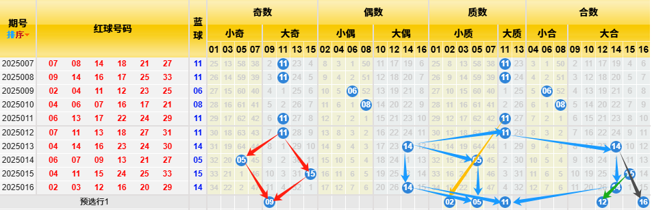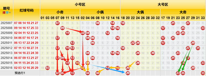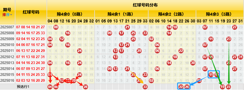 【数据参数】根据前区除4余数,组合成上图分别为余0路(简称0路)4、8、12、16、20、24、28、32);余1路(简称1路)1、5、9、13、17、21、25、29、33;余2路(简称2路)2、6、10、14、18、22、26、30;余3路(简称3路)3、7、11、15、19、23、27、31。
